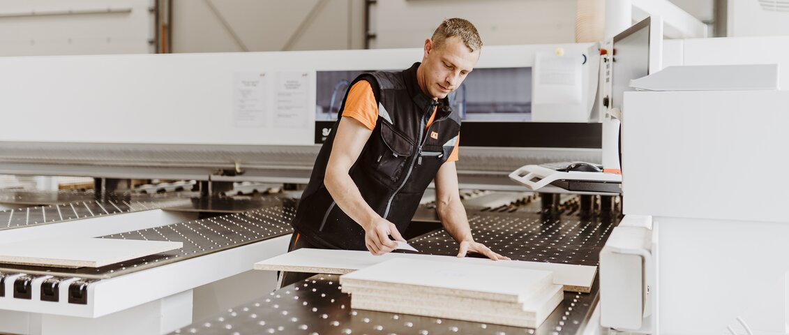 Dysponujemy nowoczesnymi centrami stolarskimi o dużej powierzchni. Centrum w Robakowie wyposażyliśmy w dwie specjalistyczne linie produkcyjne. Pierwsza z nich to linia firmy Homag z magazynem automatycznym, który pozwala na skrócenie czasu realizacji zamówień. Druga to linia do oklejania obrzeży ABS. W procesie wykorzystujemy klej poliuretanowy, co znacząco podwyższa wodoodporność krawędzi. Posiadamy też piłę panelową i oferujemy szeroką gamę nawiertów. Szybko, precyzyjnie, w jednym miejscu.