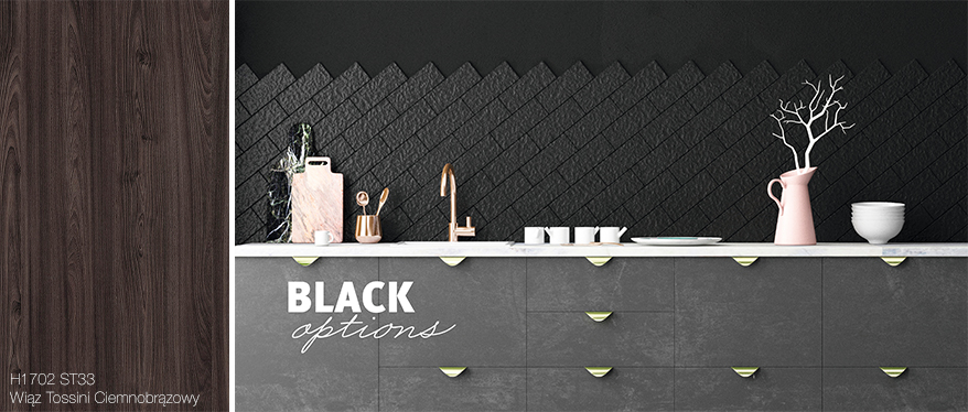 Zapraszamy do świata glamour. Wykwintna czerń dostępna w wersjach HighGloss, matowej, strukturach drewnopodobnych, jako czerń aksamitna lub wariant shadow. Furorę robi również dekor H1702 ST33 Wiąz Tossini Ciemnobrązowy, w którym naturalny rysunek drewna wzbogacono o efekt perłowego połysku. Wrażenie potęguje struktura synchroniczna ST33 Feelwood Crafted - o fakturze ręcznie heblowanej powierzchni. Wzory w formacie XL są mało powtarzalne i znakomicie czują się na dużych powierzchniach.