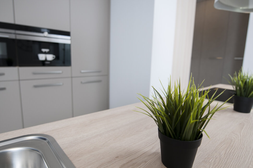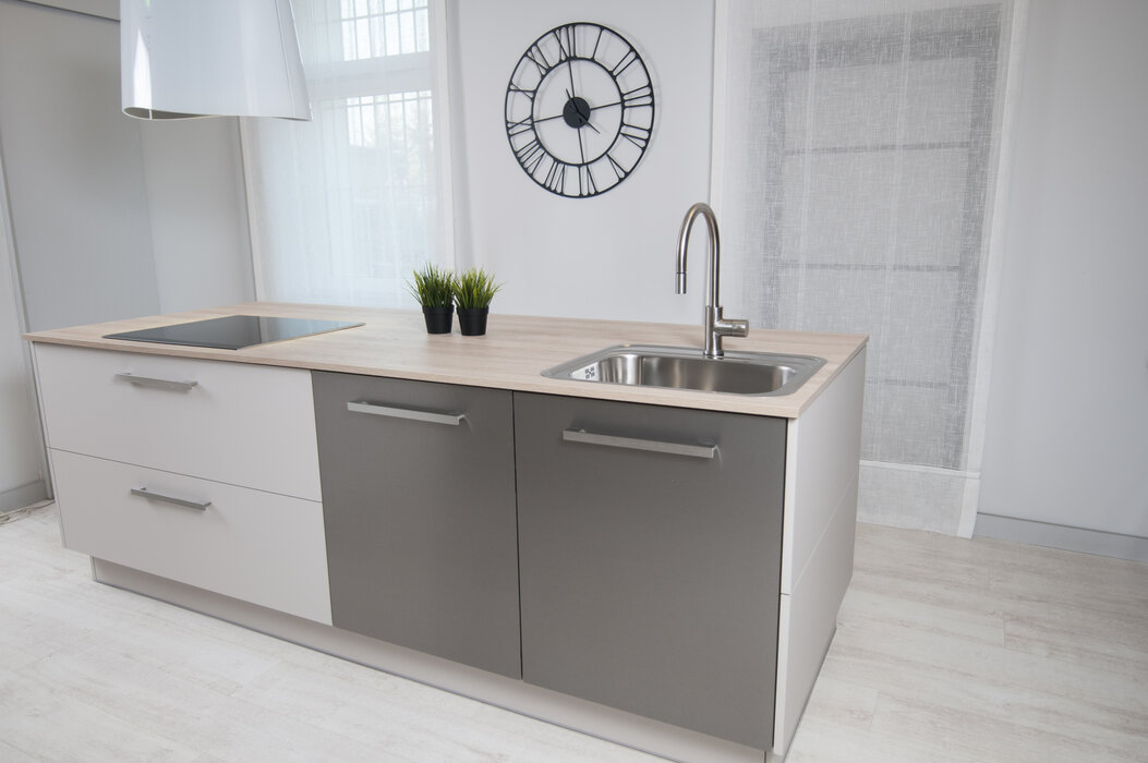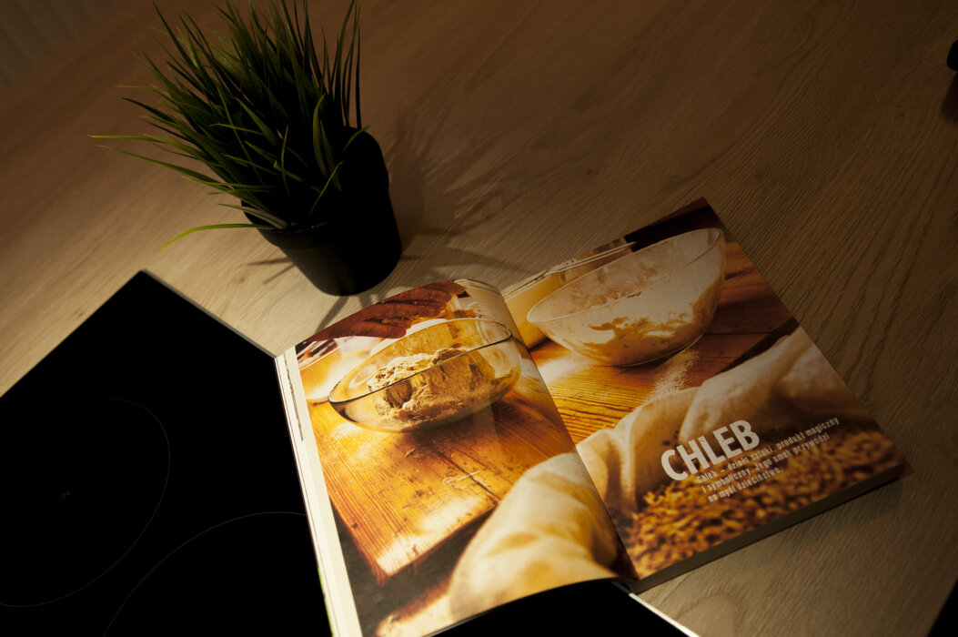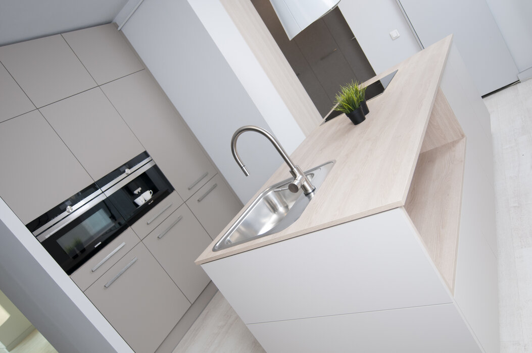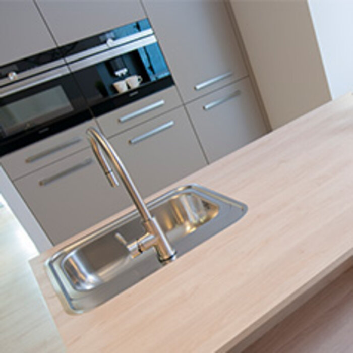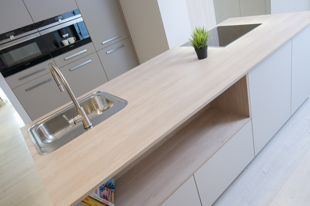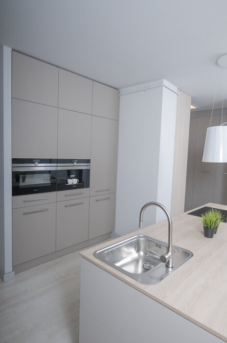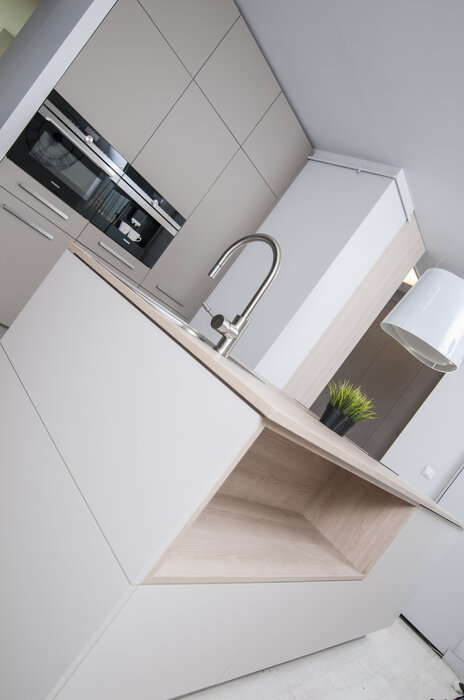 Ekspozycja wykonana została na bazie płyt meblowych Egger. Wszystkie korpusy oraz blat wyspy wykonane zostały z dekoru H3309 ST28 Dąb Gladstone Piaskowy. Fronty natomiast, zrobione zostały na bazie kolekcji Perfect Sense. W wysokiej zabudowie kuchennej użyto płyt U732 PM/ST2 Szary Przykurzony, a fronty na wyspie wykonane zostały z dekoru U732 PM/ST2 przełamanego dekorem U708 PM/ST2 jasnoszary.