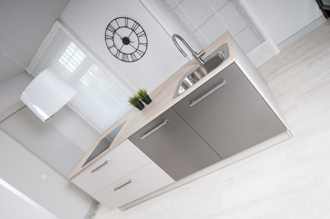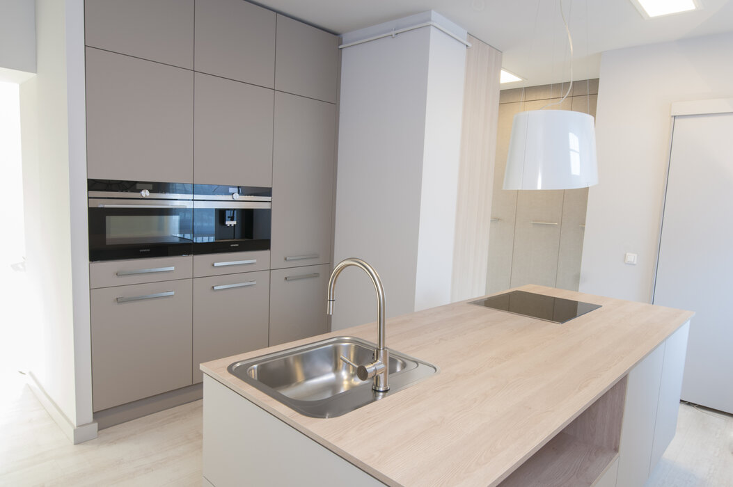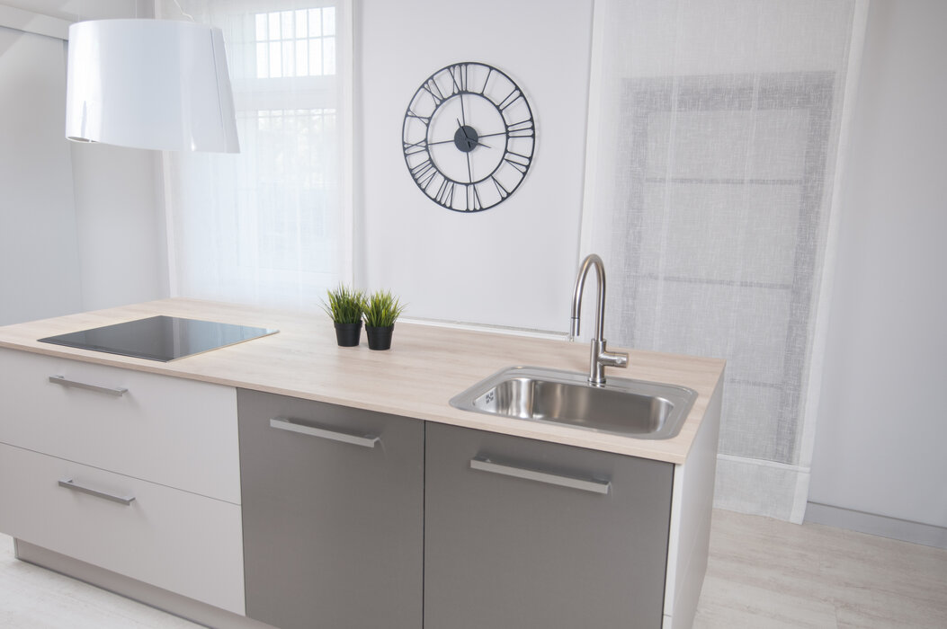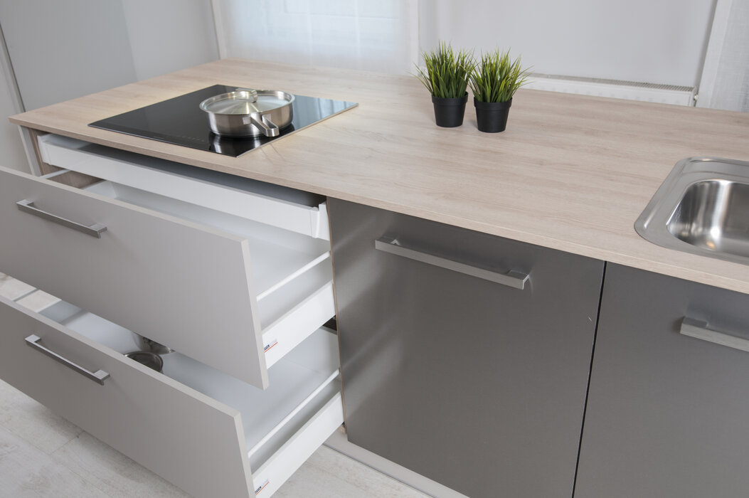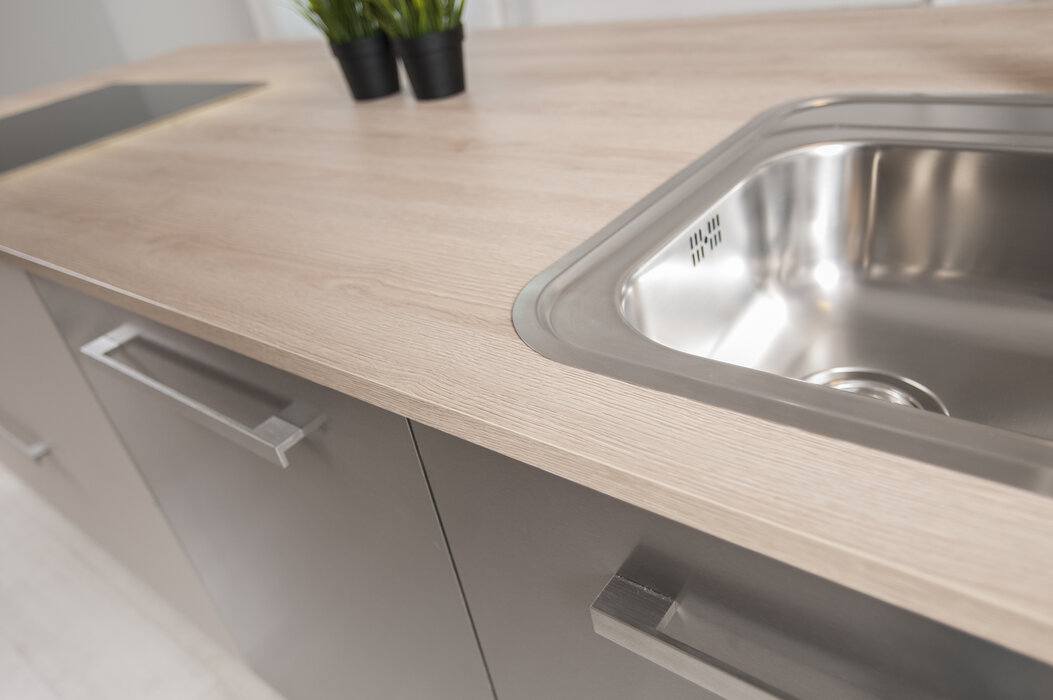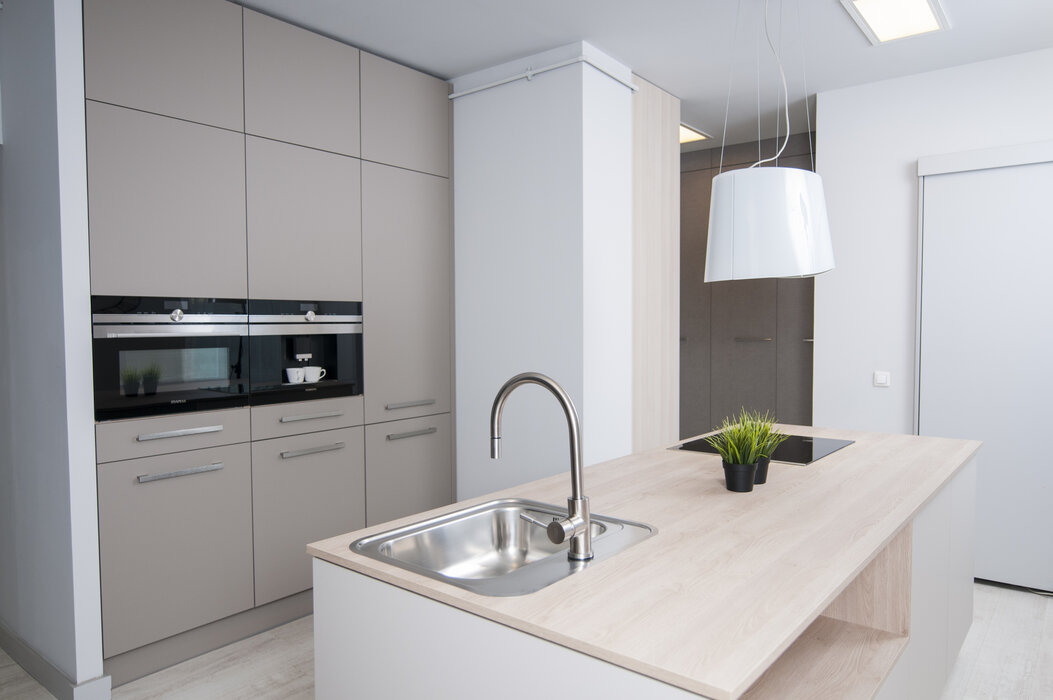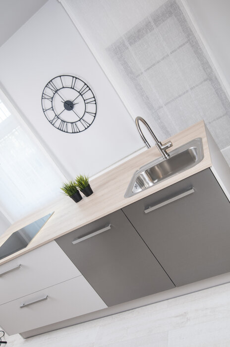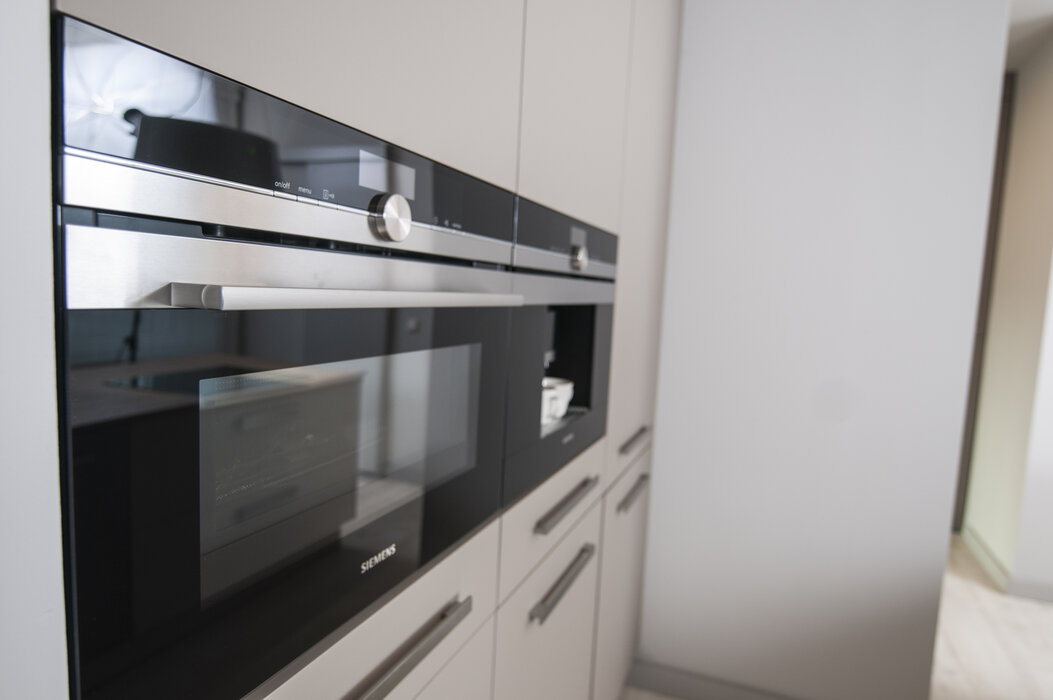 Ekspozycja wykonana została na bazie płyt meblowych Egger. Wszystkie korpusy oraz blat wyspy wykonane zostały z dekoru H3309 ST28 Dąb Gladstone Piaskowy. Fronty natomiast, zrobione zostały na bazie kolekcji Perfect Sense. W wysokiej zabudowie kuchennej użyto płyt U732 PM/ST2 Szary Przykurzony, a fronty na wyspie wykonane zostały z dekoru U732 PM/ST2 przełamanego dekorem U708 PM/ST2 jasnoszary.