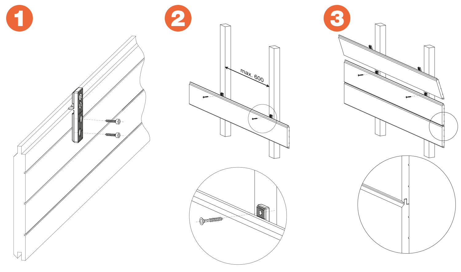 Wersja do montażu elewacji o profilu z pióro-wpustem posiada dodatkowy otwór oraz wkręt pozwalający na szybki na montaż do legara pomimo wydłużanej części pióra.