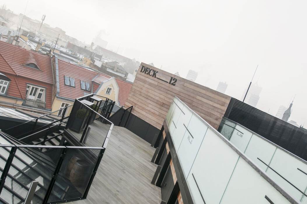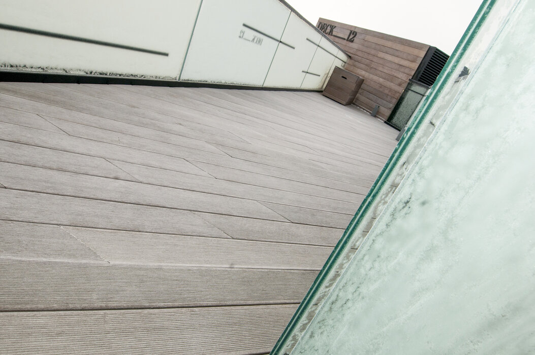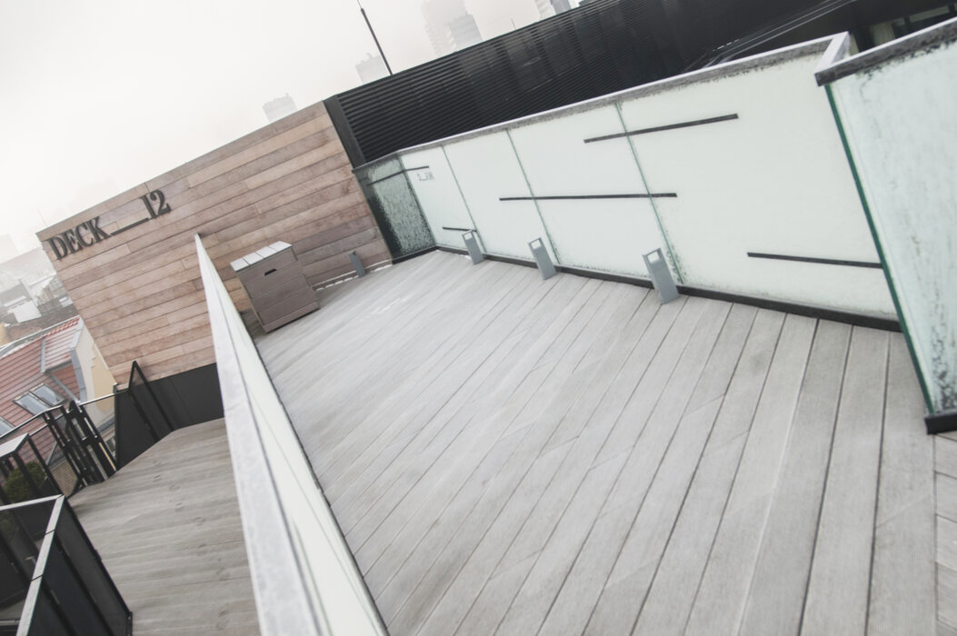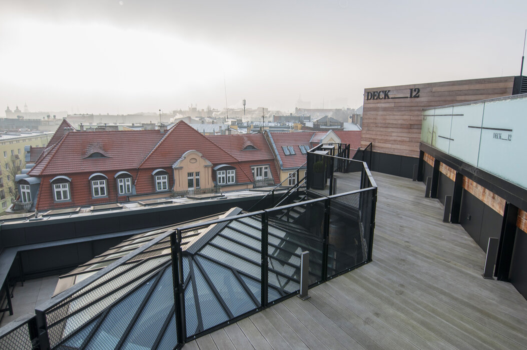 Na najwyższym piętrze Młyńska12 w Poznaniu, znajduje się piękny taras wykonany z naszej deski Ipe, zamontowanej na system niewidocznego montażu DILA.