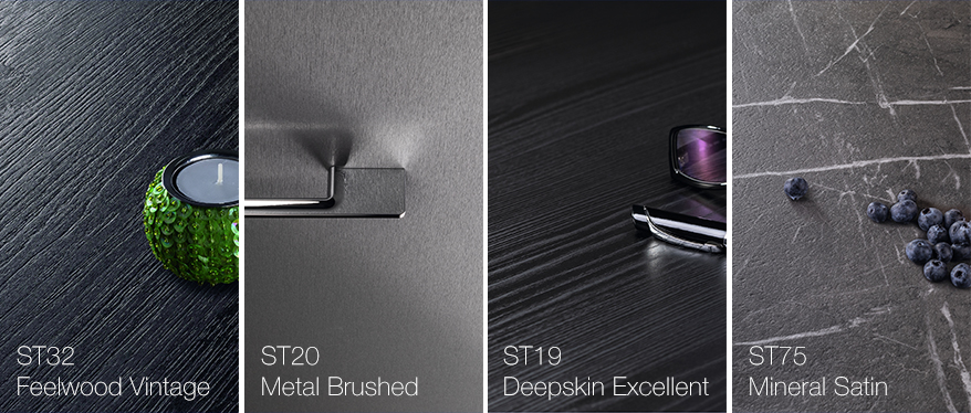 Świat struktur to przede wszystkim jeszcze więcej doznań zmysłowych. Producent wprowadza ST32 Feelwood Vintage, ST19 Deepskin Excellent, ST20 Metal Brushed oraz stworzoną specjalnie z myślą o blatach roboczych - ST75 Mineral Satin. Struktury Feelwood wyróżniają się realistyczną w dotyku powierzchnią, nawiązującą do rysunku naturalnego drewna, lecz dostępną przy użyciu atrakcyjnych cenowo płyt. Głęboki i naturalny wygląd malowanego drewna zapewnia również drewnopochodna struktura Deepskin Excellent o linearnym charakterze. Metal Brushed to propozycja dla fanów surowego wyglądu szczotkowanego metalu. Natomiast Mineral Satin nadaje dekorom aksamitny wygląd i dopełnia „marmurową” nieregularność.