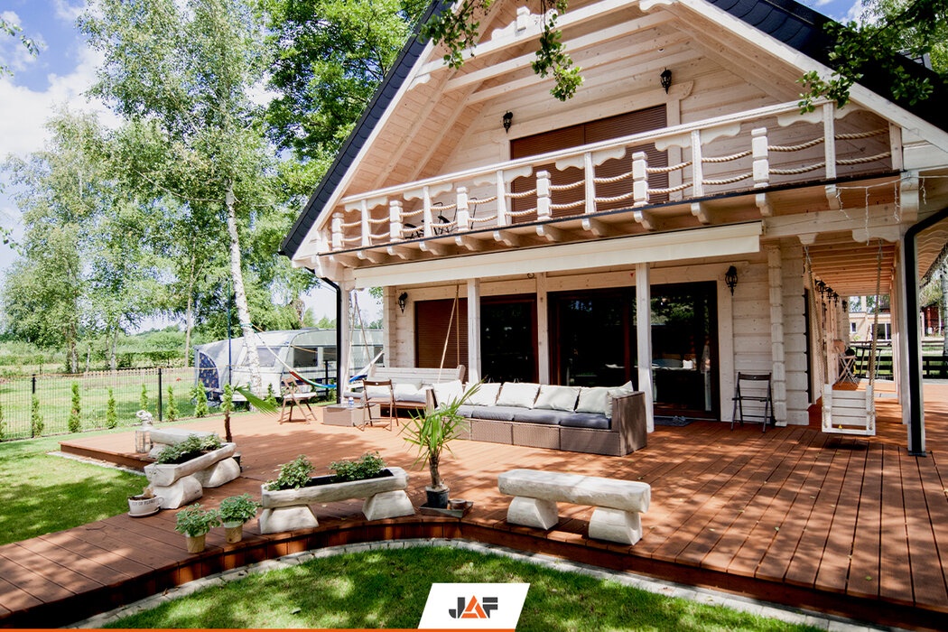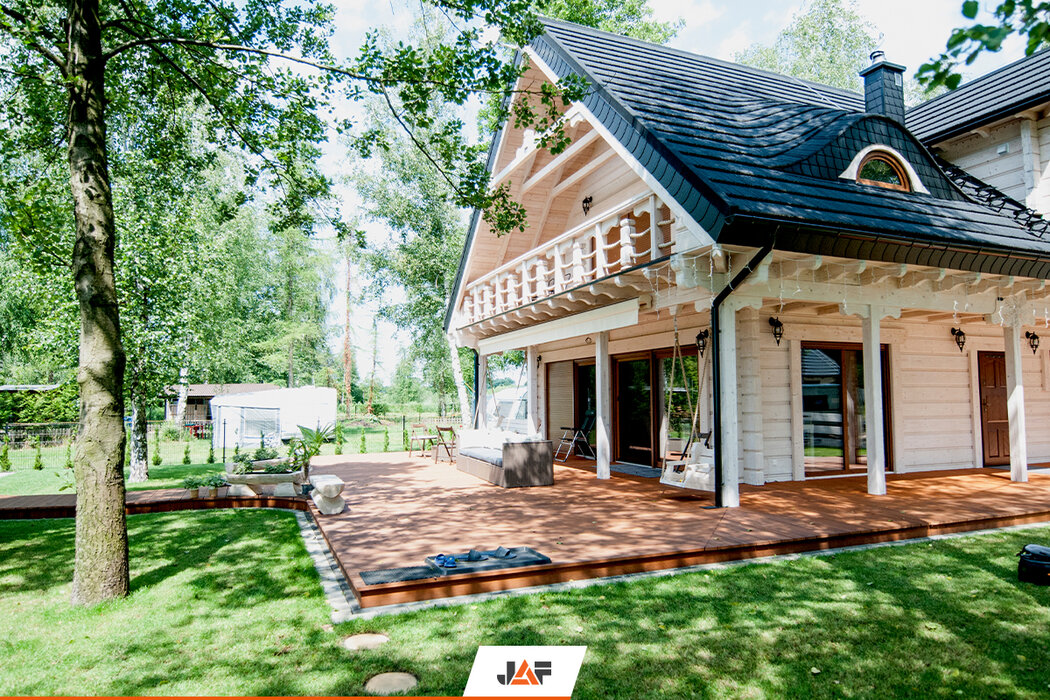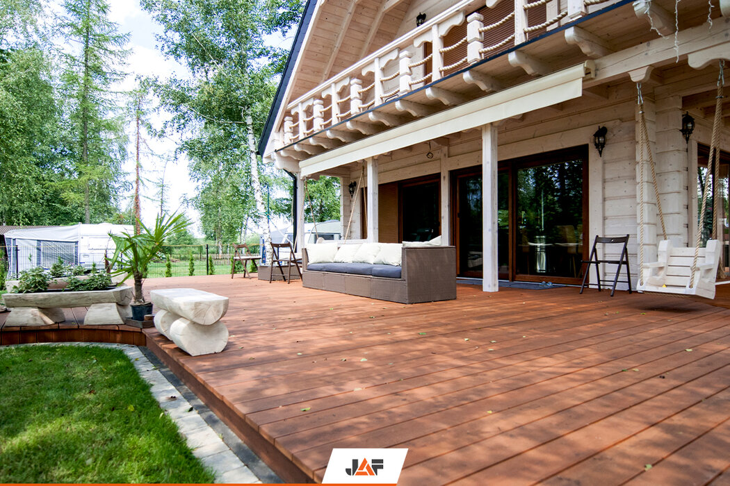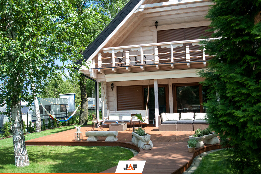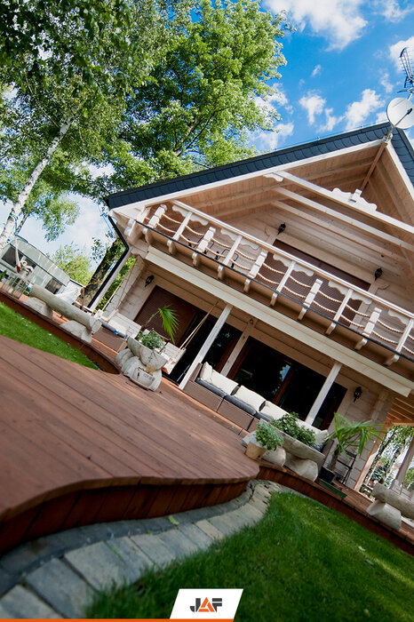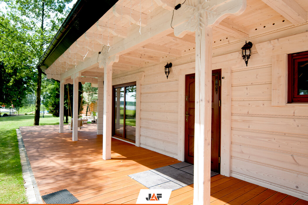 Na zewnątrz dom otoczony jest pięknym tarasem wykonanym z modrzewia syberyjskiego w klasie PRIMA 27x140 oraz z legarów modrzewiowych 45x70 stanowiących konstrukcję nośną. Taras został wykończony olejem bangkirai OSMO 006. Cały budynek zabezpieczono oraz pomalowano w naturalnym kolorze świerku, za pomocą OSMO 9211.