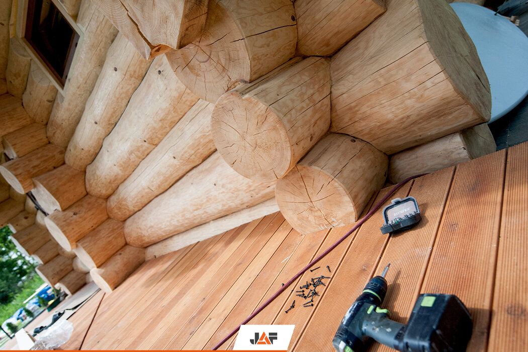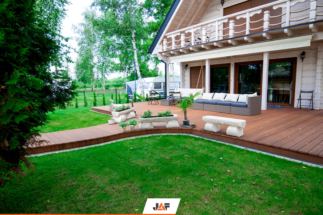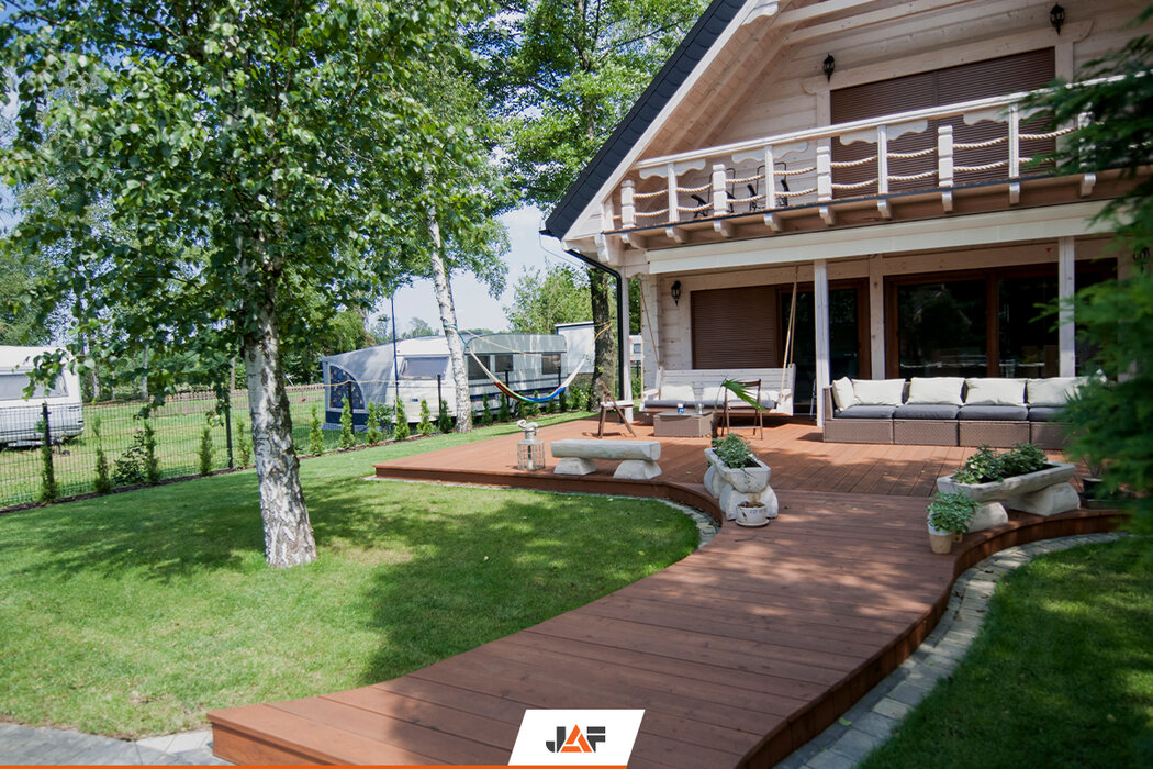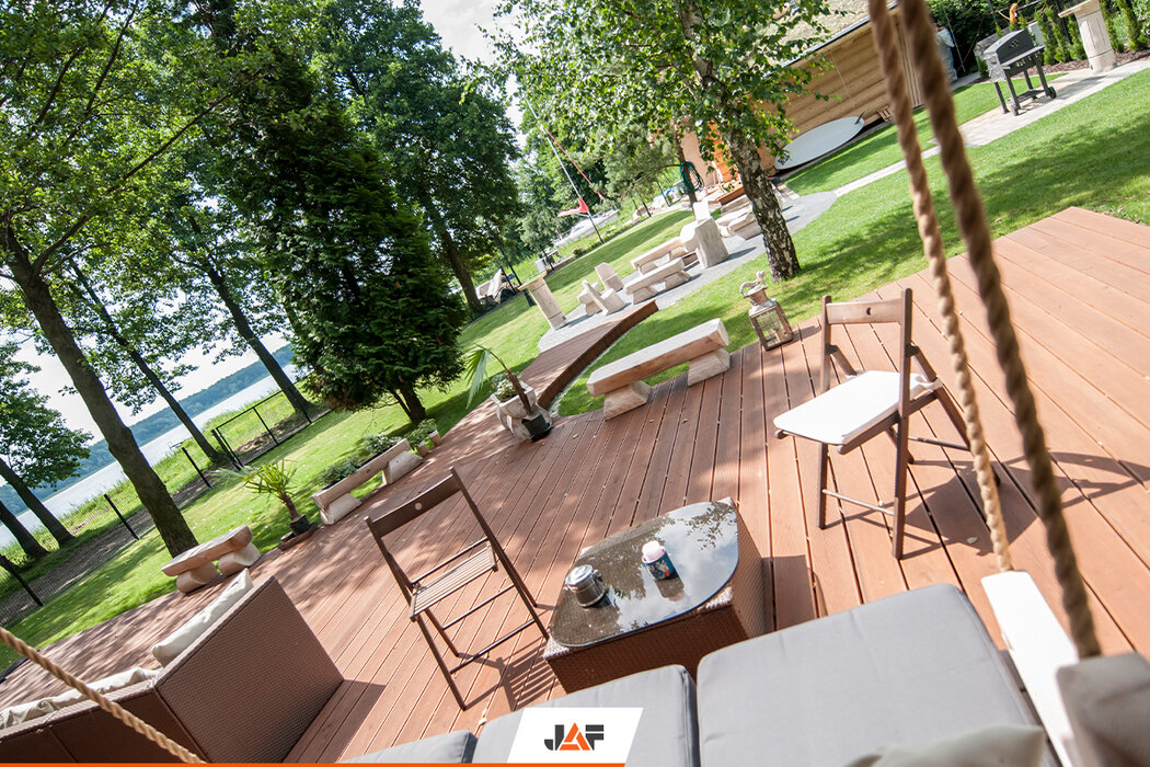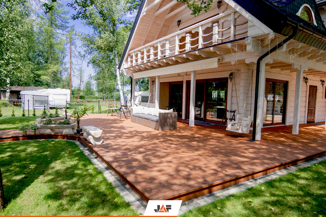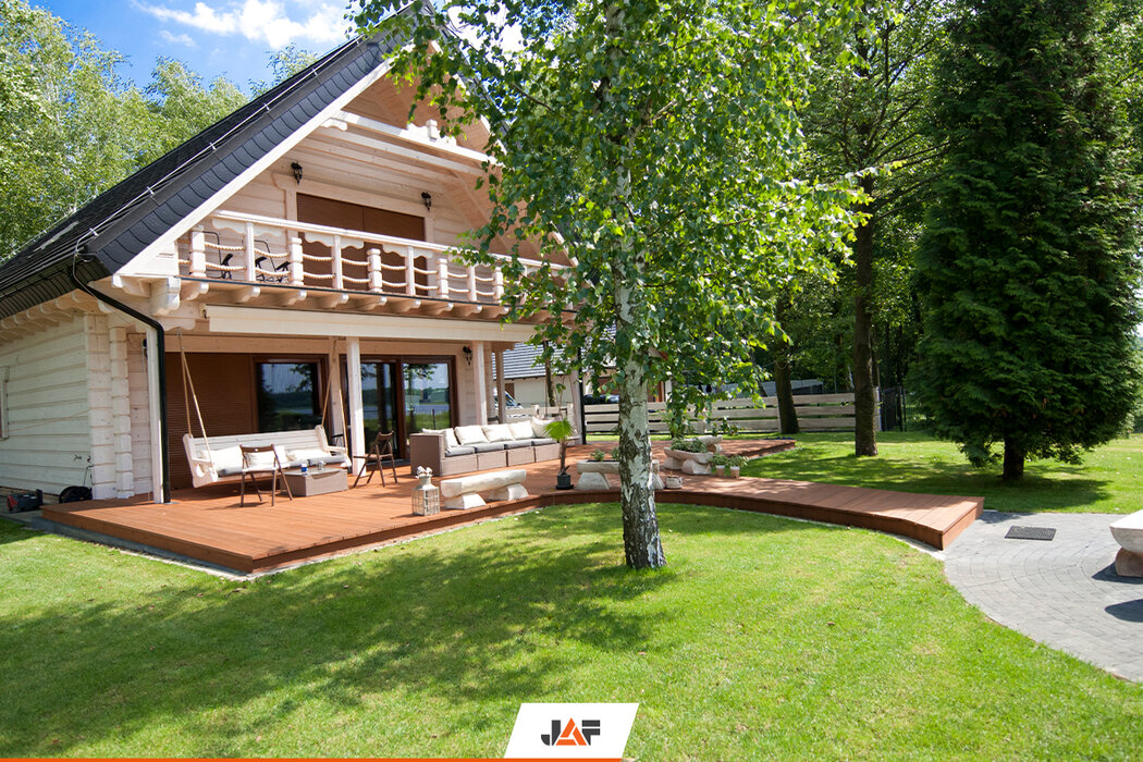Na zewnątrz dom otoczony jest pięknym tarasem wykonanym z modrzewia syberyjskiego w klasie PRIMA 27x140 oraz z legarów modrzewiowych 45x70 stanowiących konstrukcję nośną. Taras został wykończony olejem bangkirai OSMO 006. Cały budynek zabezpieczono oraz pomalowano w naturalnym kolorze świerku, za pomocą OSMO 9211.