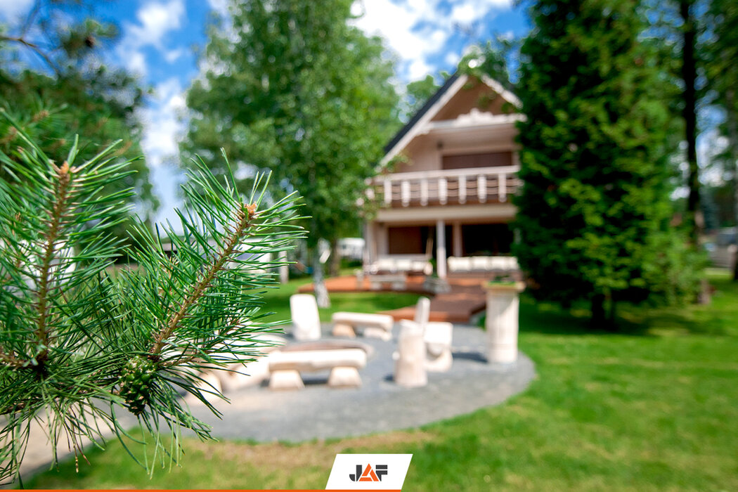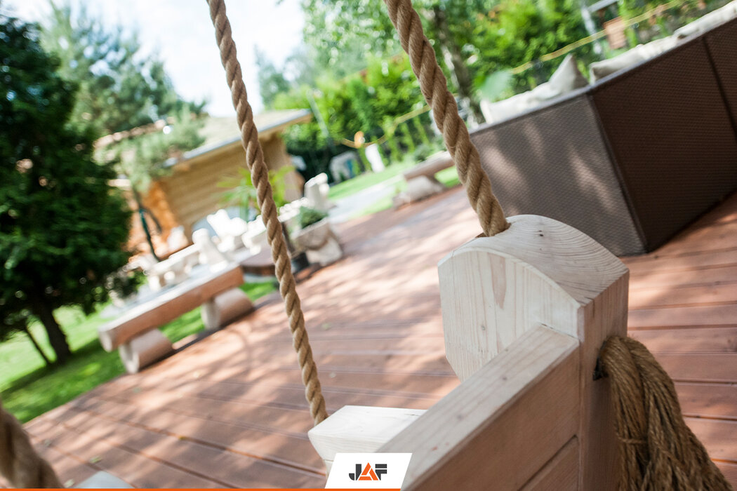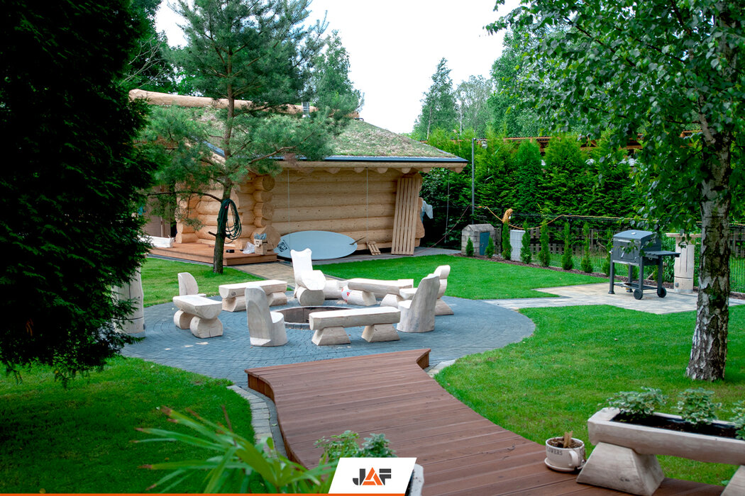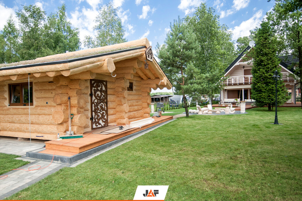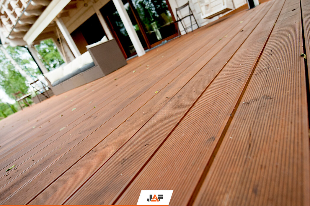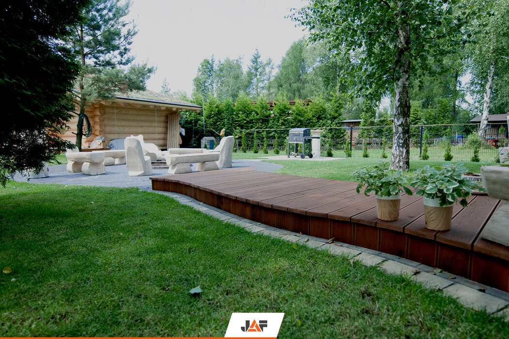 Na zewnątrz dom otoczony jest pięknym tarasem wykonanym z modrzewia syberyjskiego w klasie PRIMA 27x140 oraz z legarów modrzewiowych 45x70 stanowiących konstrukcję nośną. Taras został wykończony olejem bangkirai OSMO 006. Cały budynek zabezpieczono oraz pomalowano w naturalnym kolorze świerku, za pomocą OSMO 9211.