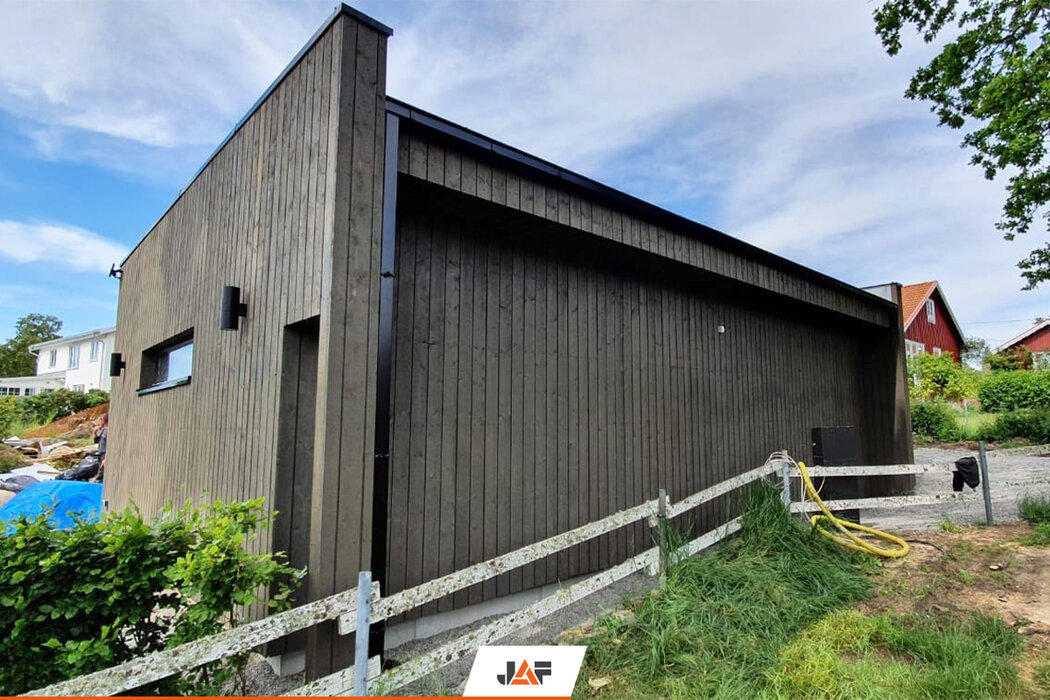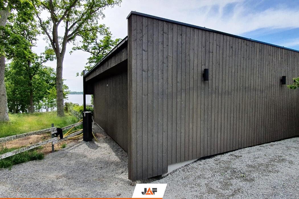 Dom dla samochodu również może być efektowny i pasować do otoczenia. Tak jest właśnie z tym garażem, w jednej ze szwedzkich miejscowości. Firma Genero, specjalizująca się w projektowaniu i budowaniu energooszczędnych, pasywnych domów jednorodzinnych, postawiła na naszą elewację w profilu zetka szorstka ze świerka skandynawskiego. Na potrzeby tej realizacji dostarczyliśmy 200 m2 desek. Prawda, że efekt cieszy oko?