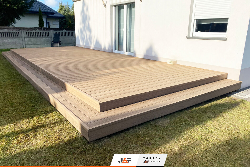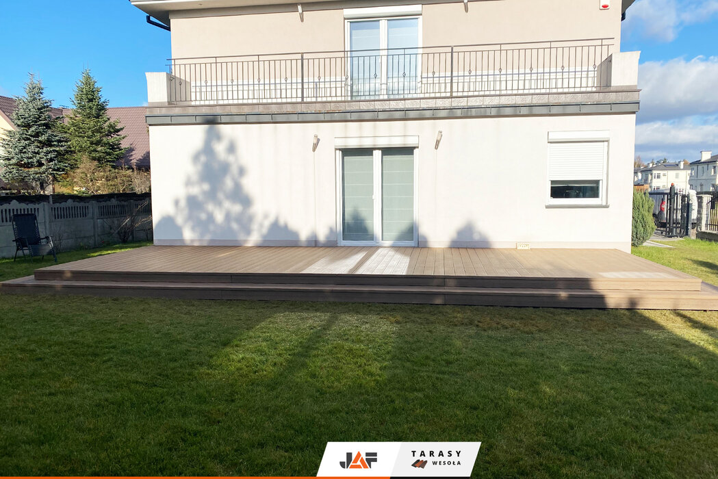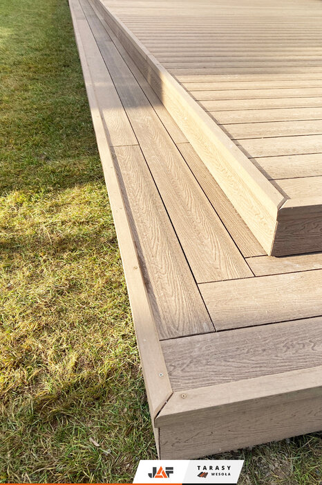 Nasza deska kompozytowa Gardin Natur w kolorze Złoty Teak, pojawiła się niedawno na jednym z osiedli domów jednorodzinnych w Łazach pod Warszawą. Poza dokładnym wykończeniem krawędzi tego tarasu, zadbano także o stopień ułatwiający wchodzenie i schodzenie, który pięknie dopełnia całości.
