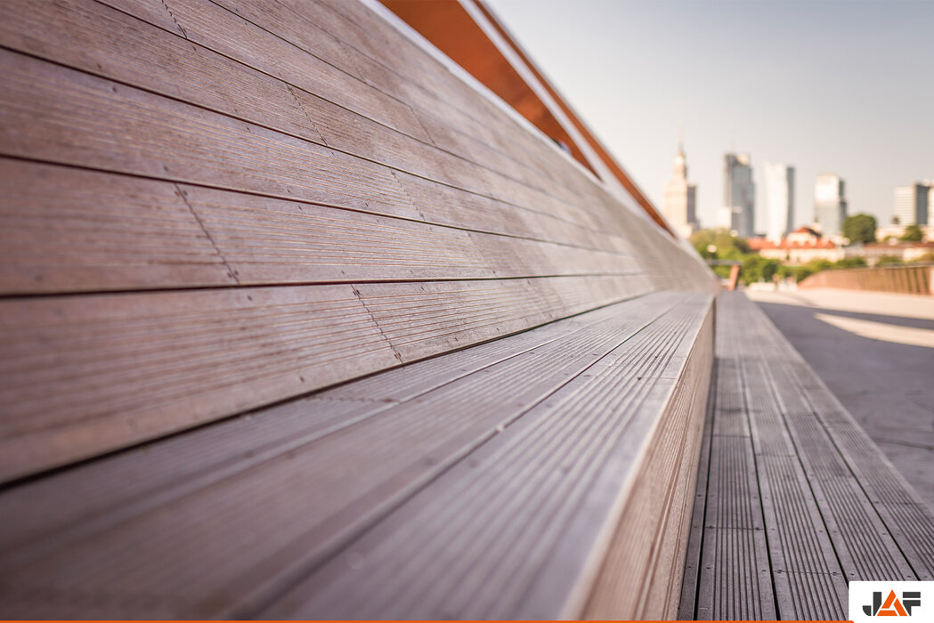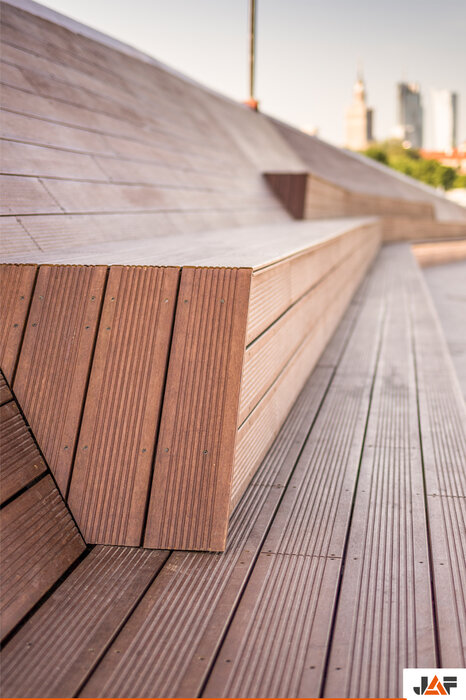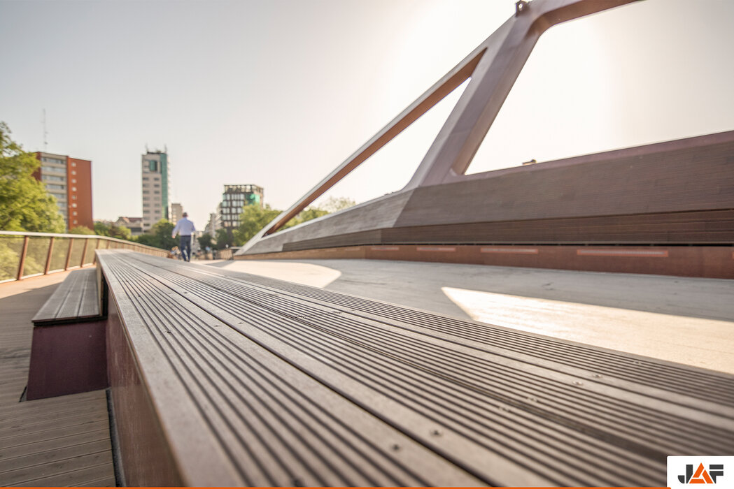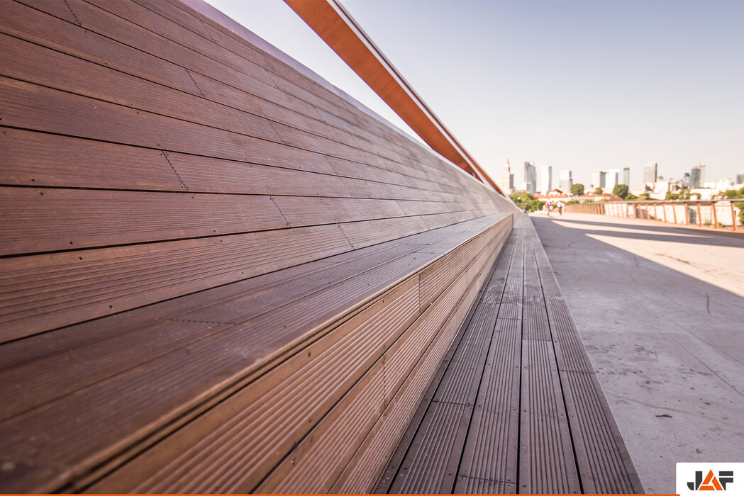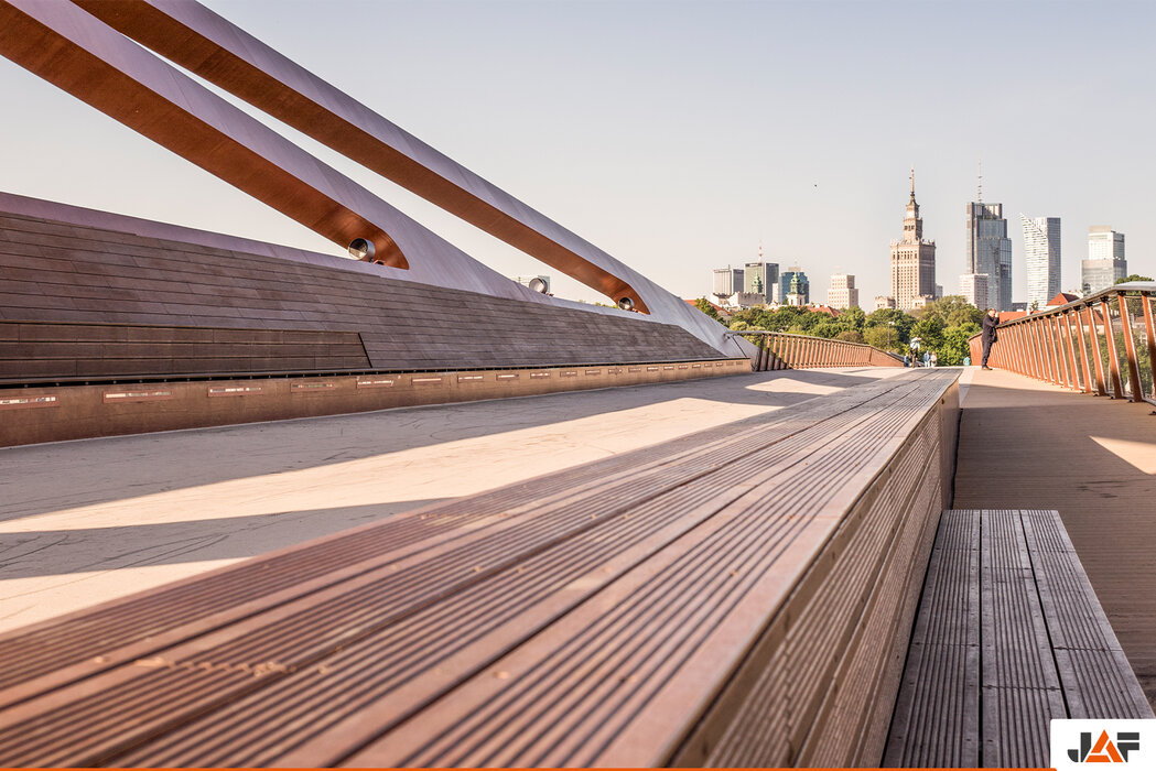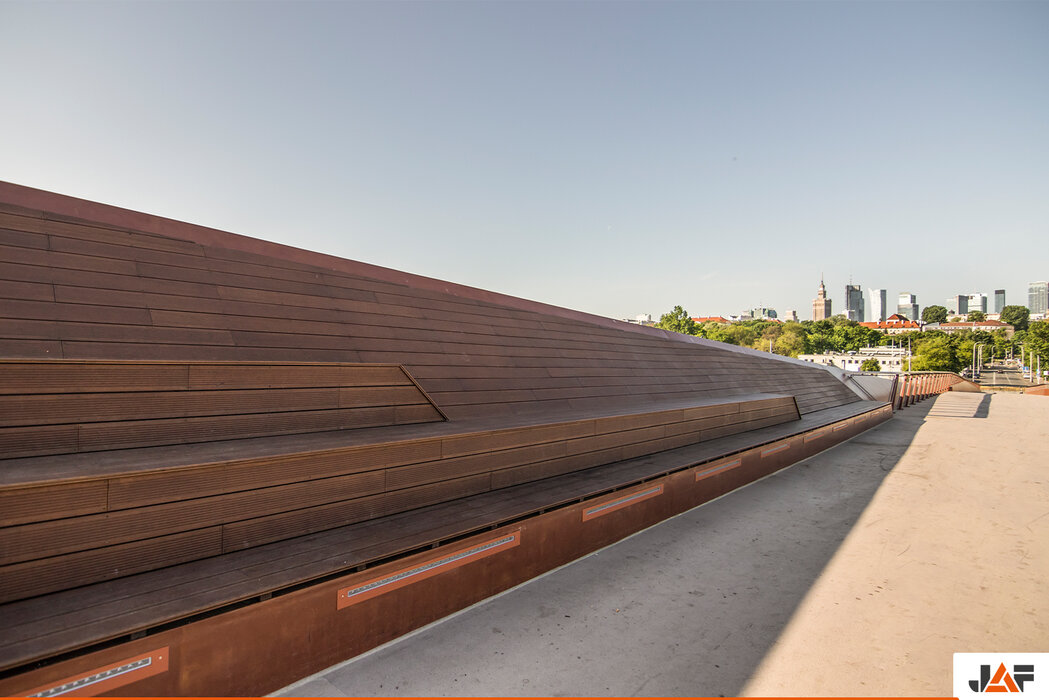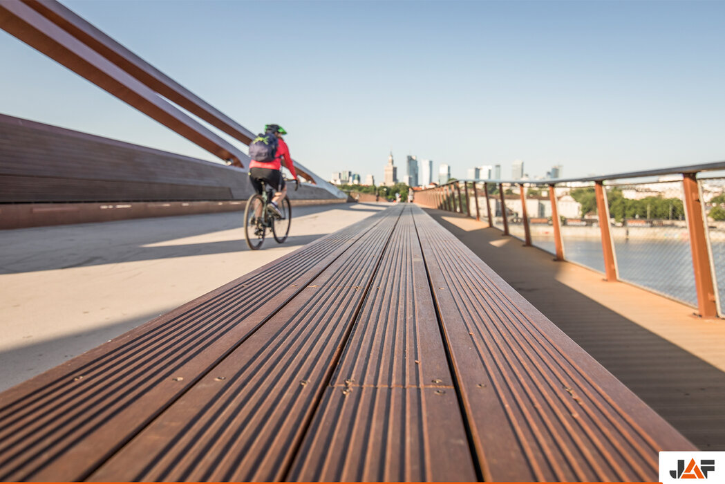 JAF Polska dostarczył nad Wisłę materiały drewnopochodne. Mówiąc prosto z mostu, zaopatrzyliśmy kładkę w deski! Do projektu wybrano ryflowane bambusowe deski tarasowe Dasso CTECH 20x137 mm w wariancie kolorystycznym Cognac. Do podkonstrukcji posłużyły legary bambusowe XTR. Deski posłużyły do budowy ławek oraz oparć rozmieszczonych wzdłuż kładki.