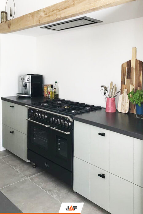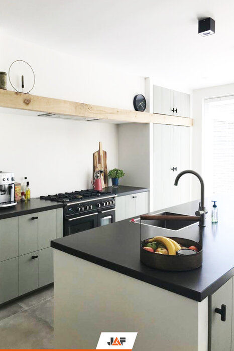 Zieleń, czerń, biel i naturalne drewno. W tej kuchni można poczuć się bliżej natury. Cała zabudowana została wykonana z produktów firmy EGGER. Konstrukcja szafek oparta jest na płycie laminowanej Biały Premium (W1000 ST9), ale to ich lakierowane fronty (FIS RAL 1000) grają tu pierwsze skrzypce. Obszar roboczy to czarny blat (U999 ST 89), który idealnie komponuje się z równie czarną kuchenką.