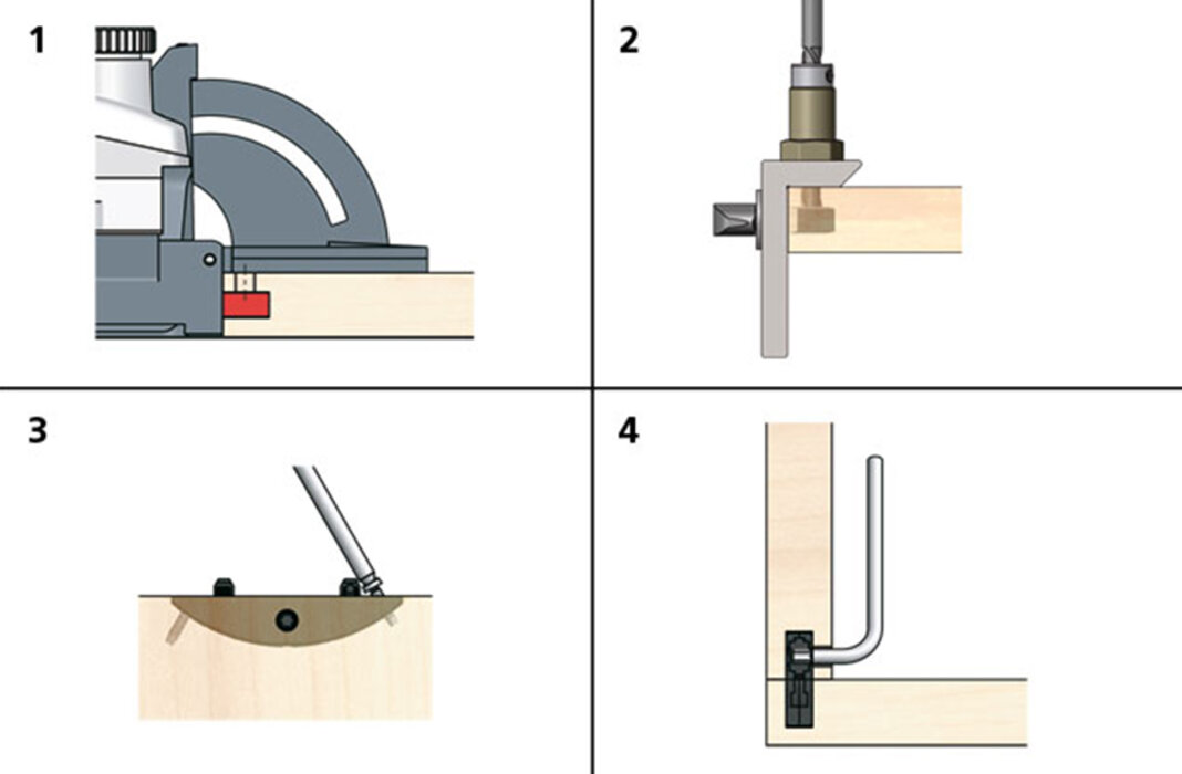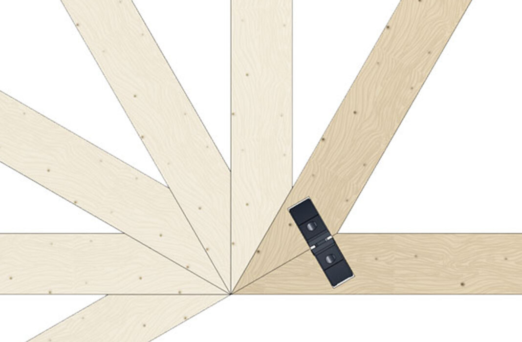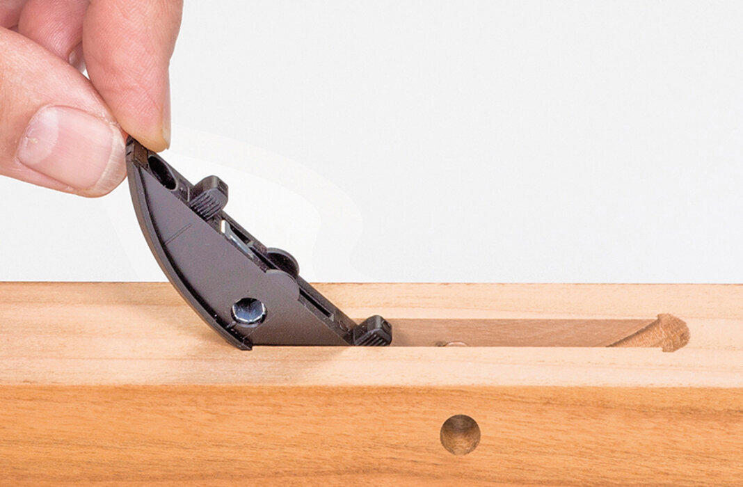 Wzmocniona włóknem szklanym złączka, służy do łączenie płyt i narożników pod kątem od 60° do 180°. Znakomite rozwiązanie połączeń dla prostych płyt 16 mm i uciosowych płyt 18 mm. Wszystko bez użycia kołków, kleju oraz wiercenia otworów o dużej średnicy – do zamykania i otwierania połączeń wystarczy Ø= 6 mm. Boczna tolerancja na poziomie +/- 1 mm eliminuje drobne różnice wynikające z montażu ręcznego. Wypustki umieszczone po bokach bolców wzmacniają stabilność mocowania. Łączy, poziomuje i zapobiega skręcaniu. Konstrukcje można wielokrotnie składać i rozkładać, co znacząco ułatwia transport i montaż. Montaż z wykorzystaniem frezarki do gniazd lub technologii CNC.