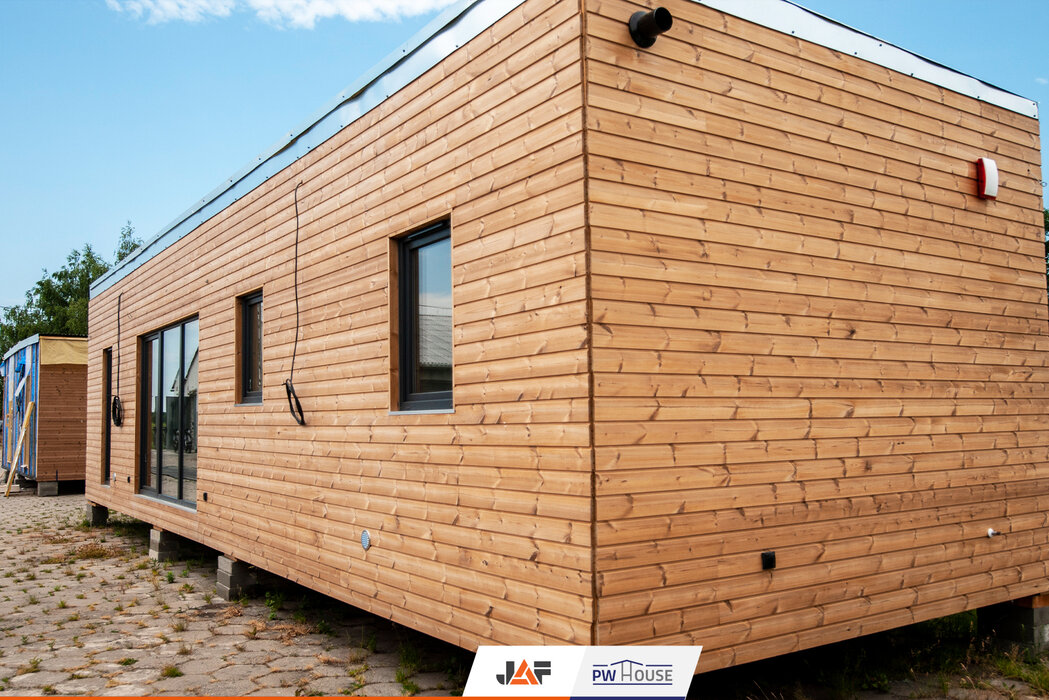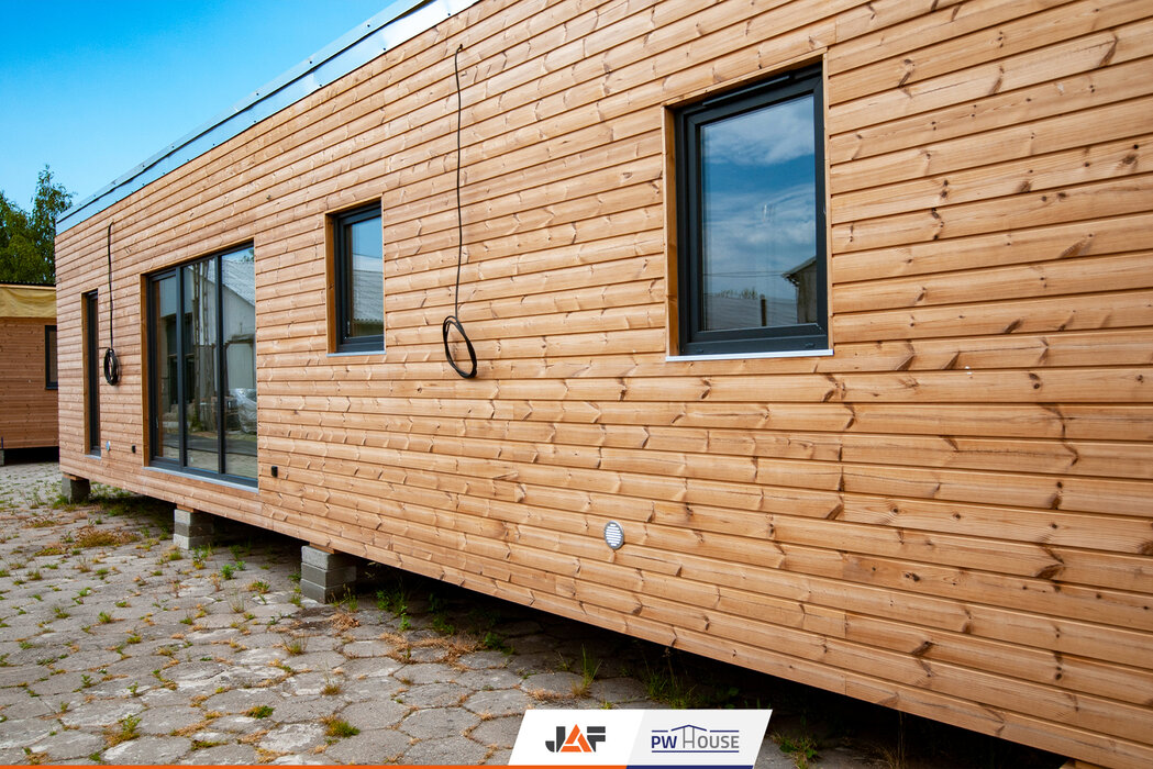 Przedstawiamy mobilne domy powstające w systemie szkieletowym. Konstrukcja wykonana jest z solidnego drewna KVH® oraz litego w klasie C24. Do zewnętrznej elewacji budynku zastosowano deski elewacyjne z Termoświerk TGV 19x140 mm.