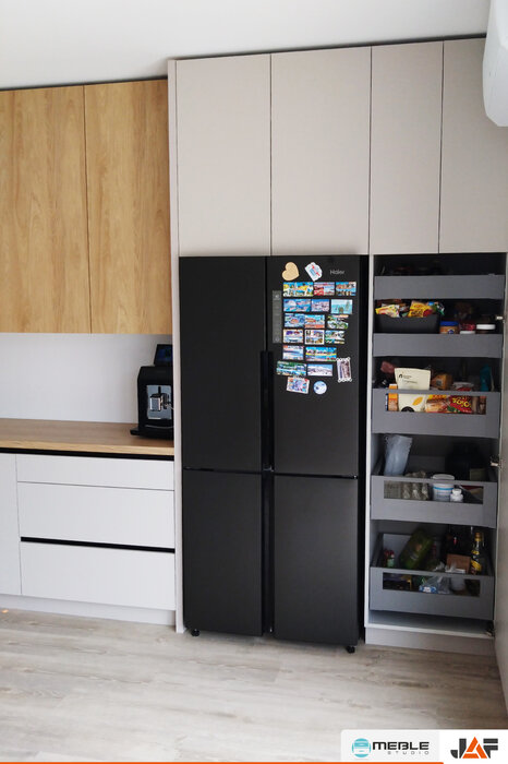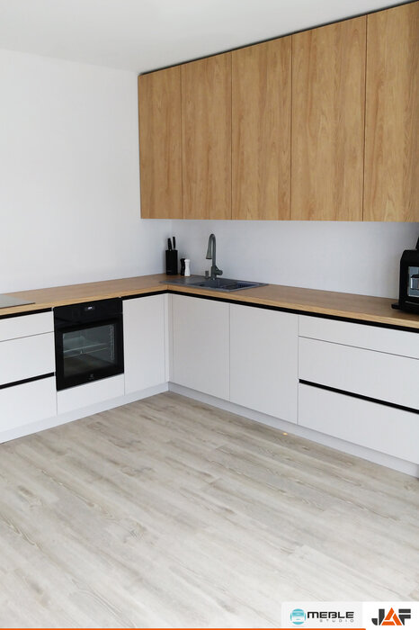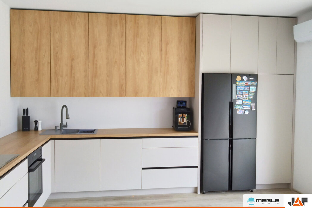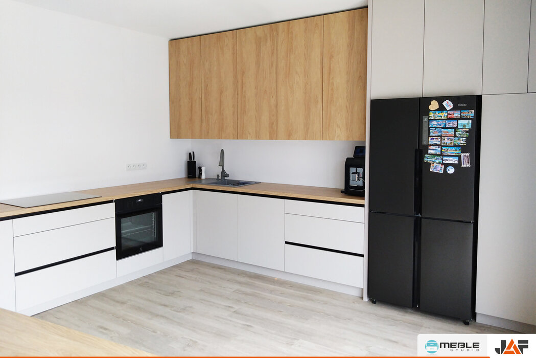 Całość prezentuje się schludnie, nowocześnie, a zarazem bardzo przestrzennie. Szafki otwierane na dotyk to praktyczne rozwiązanie, które jest równie wygodne, co estetyczne. Górny rząd w kontrastującym dekorze znakomicie wpasował się w zagłębienie i zgrabnie zgrał z blatem. Dzięki temu zabiegowi całość zyskała na lekkości i wygląda o wiele ciekawiej. O solidność wykonania też nie trzeba się martwić, gdyż realizacją zajęli się doświadczeni specjaliści z Meble Studio, a zastosowane materiały i rozwiązania pochodzą od renomowanych producentów. Płyty EGGER PerfectSense i szuflady marki Blum mówią same za siebie. Zresztą, przekonajcie się sami.