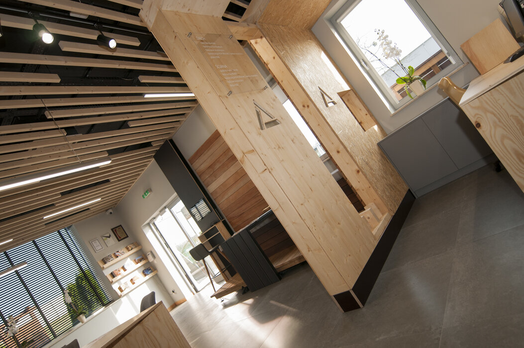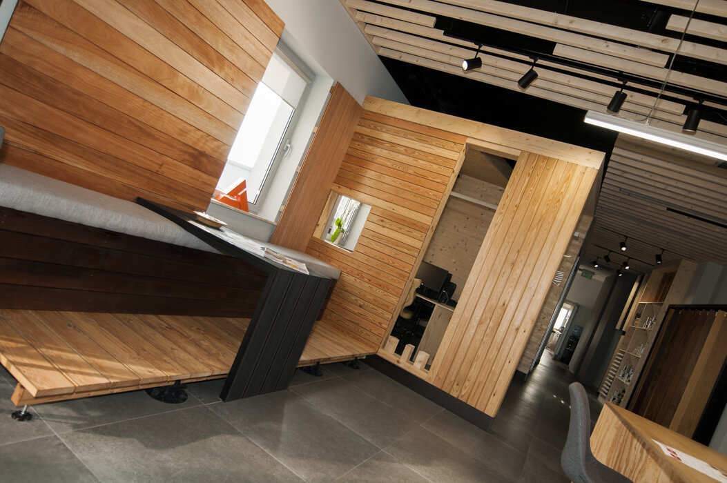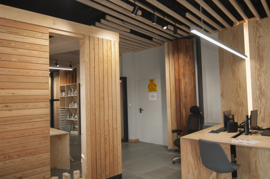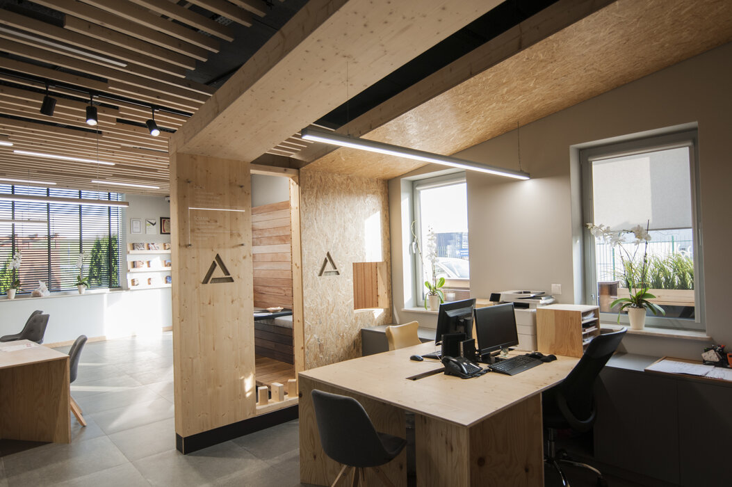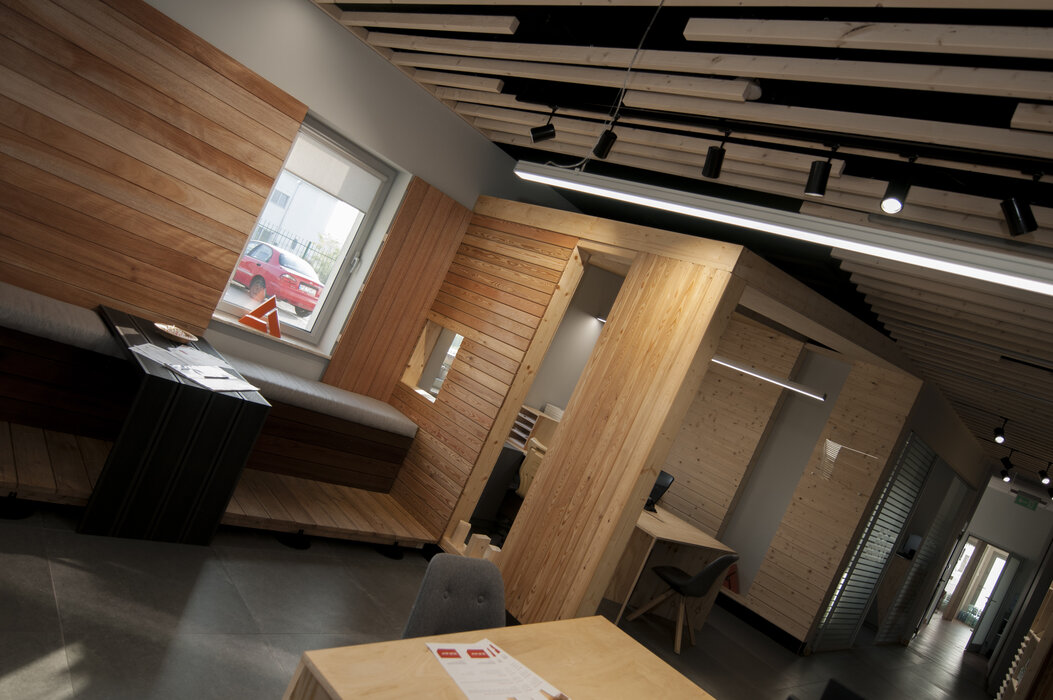 - zwieńczający całość sufit wykonany z podwieszanego drewna konstrukcyjnego.