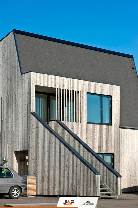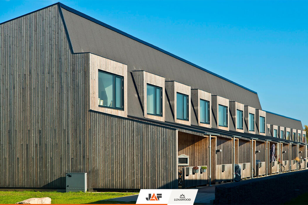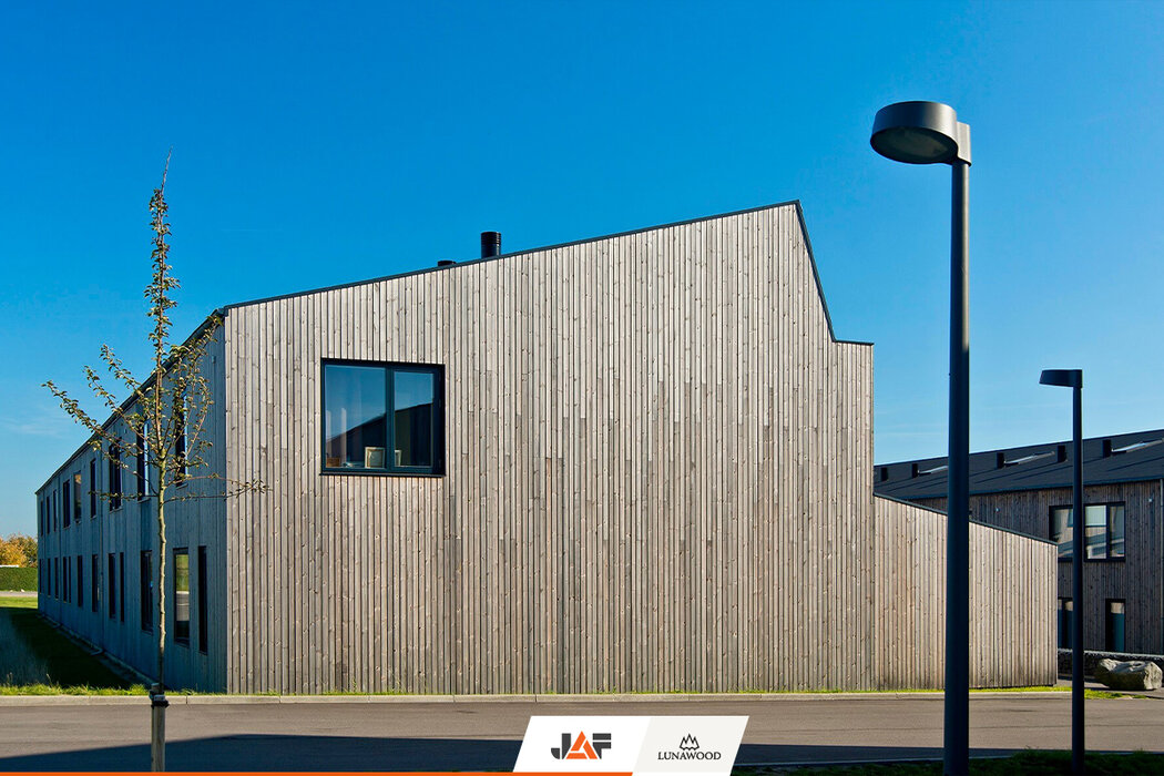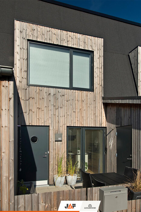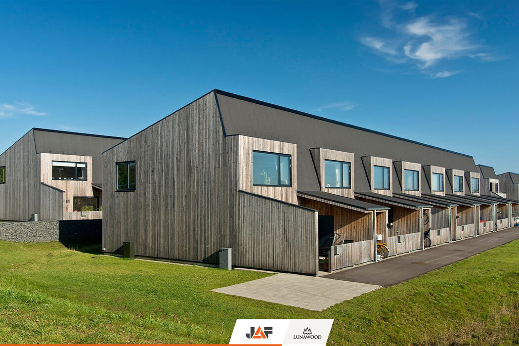 Bakkehusene to osiedle 47 domów pełnych młodych rodzin z dziećmi. Domy, zaprojektowano według linii prostych, a wykorzystanie naturalnych materiałów przyczyniło się do energooszczędności, trwałości i zdrowego środowiska. Wszystko dzięki zamonotowaniu elewacji z thermososny od Lunawood.