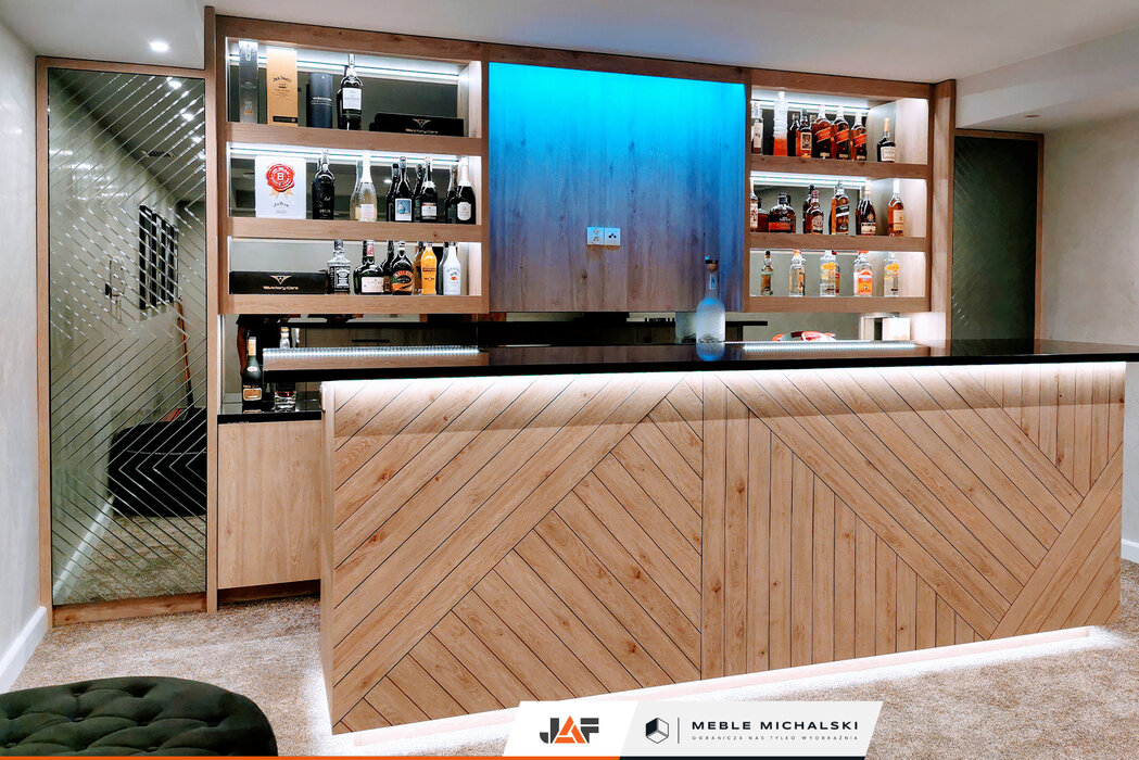 Taki dom to marzenie każdego. Własny bar, gigantyczna garderoba i przytulna sypialnia. Meble wykonała firma Meble Michalski, a materiały dostarczył JAF Polska. Zacznijmy od tego, co tygryski lubią najbardziej. Bar wygląda oszałamiająco, nie tylko za sprawą trunków na półkach. Lustrzane fronty połączone z dekorem Dąb Davos robią wrażenie. Nie zabrakło również ambientowego podświetlenia — celem wprowadzenia wieczorowego nastroju.