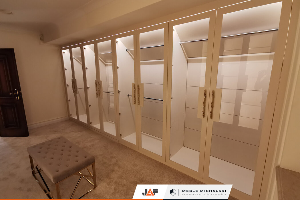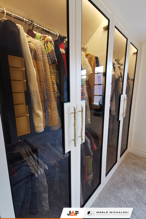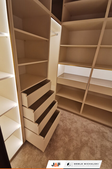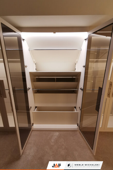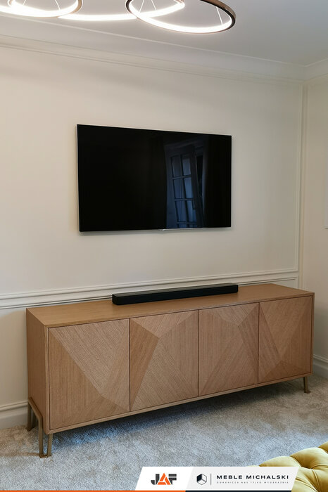 Natomiast takie garderoby zazwyczaj kojarzą się rezydencjami gwiazd w Hollywood. Istny majstersztyk, który pomieści w sobie zawartość niejednego butiku. Dobór idealnej stylizacji ułatwia oświetlenie. W sypialni pod telewizorem zobaczymy komodę o romboidalnych frontach 3D z prawdziwego dębowego forniru. Do kompletu Karol Michalski wykonał szafki nocne z trójwymiarowymi czołami szuflad. Korpusy wykonano z płyty meblowej Dąb Sorano Jasny H1334 ST9 18 mm. Na szczególną uwagę zasługują ozdobne złote uchwyty.