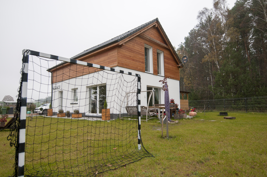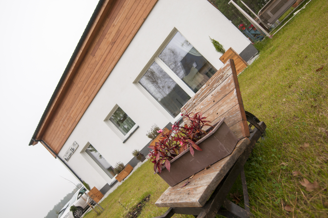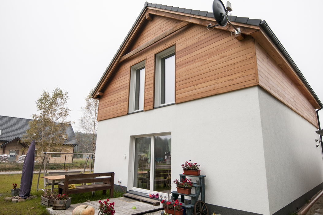 Właśnie tutaj znajdziemy tradycyjny dom wykończony elewacją z podbitki świerkowej, którego dach wspierają drewniane belki konstrukcyjne KVH.