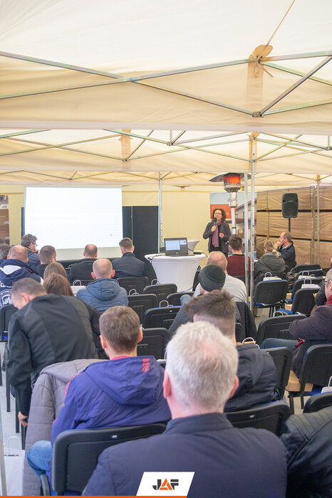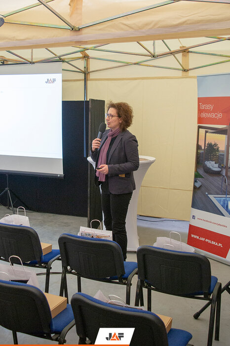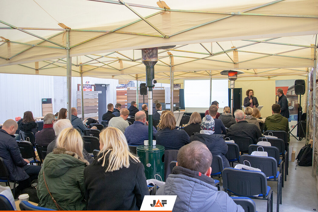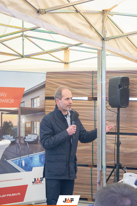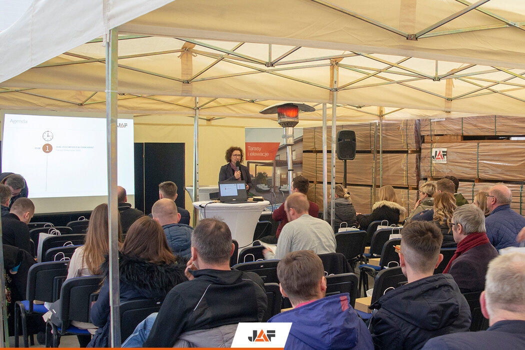 Po serdecznych powitaniach i rozmowach ze znajomymi, przeszliśmy do części merytorycznej spotkania. Goście zajęli wygodne miejsca, a szkolenie rozpoczęła Darina Lazarova. Po słowie wstępu i opowieści o początkach oraz historii firmy JAF, przeszliśmy do wrodzonych cech drewna. Wielu z klientów traktuje drewno niczym sztuczny wytwór z fabryki, o zawsze jednakowych i powtarzalnych parametrach, kolorze i wymiarach. Należy pamiętać, że każde drewno to żywy i inny organizm, a procesy takie jak np. patynowanie — absolutnie nie pogarszają kondycji desek i są procesem w pełni naturalnym. Niezależnie od tego, czy wybierzemy niezniszczalne gatunki egzotyczne, bezobsługowe drewno termowane czy też tańsze gatunki rodzime — drewno to drewno.