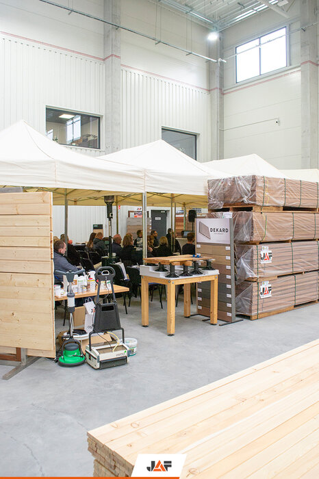 Po pierwsze, była to znakomita okazja dla naszych partnerów biznesowych i przyjaciół, aby odwiedzić nowy oddział mieszczący się przy trasie S8 na Białystok, w podwarszawskim Małopolu. Na wejściu uwagę gości przykuwała przestrzeń magazynu, o imponującej powierzchni aż 6000m². Oprócz wnętrza nowo oddanej hali, wrażenie robiły też obszerne stany magazynowe, wypełnione m.in. drewnem egzotycznym z odległych stron świata oraz drewnem termowanym, pochodzącym z mroźnej północy naszego kontynentu. Do wyboru, do koloru — i to wszystko od ręki!
