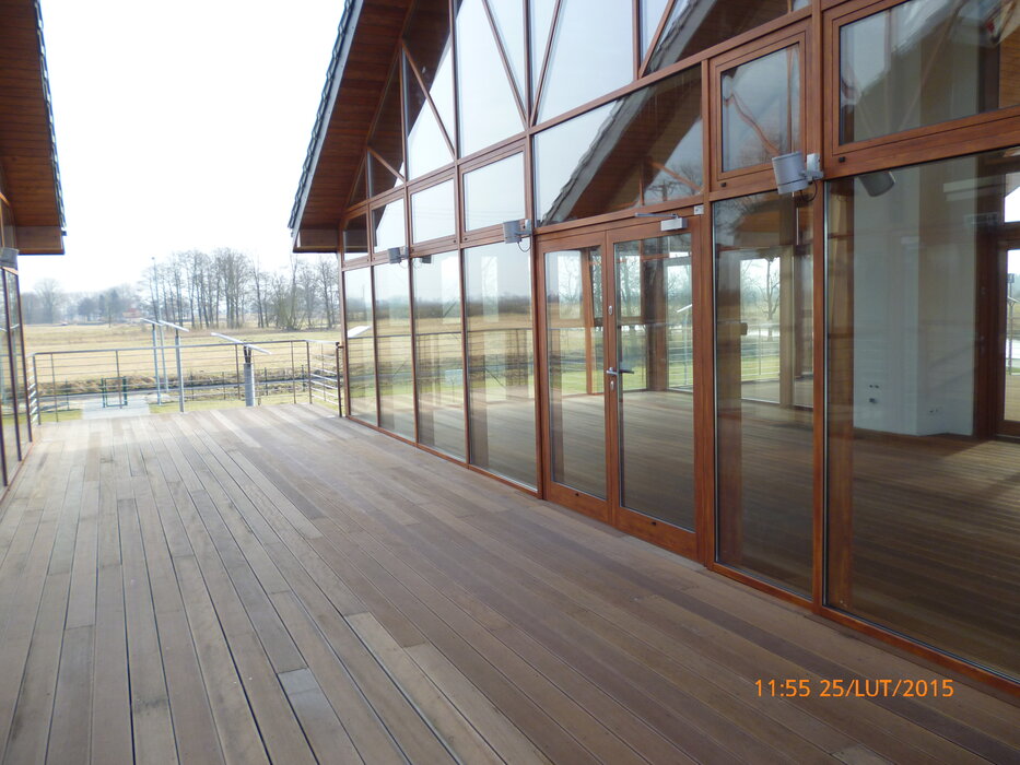 Do realizacji projektu, dostarczyliśmy deskę profilowaną BANGKIRAI 25mm x 145mm w ilości ~350 m2, łącznie z legarami oraz wkrętami i osprzętem do montażu tarasu.