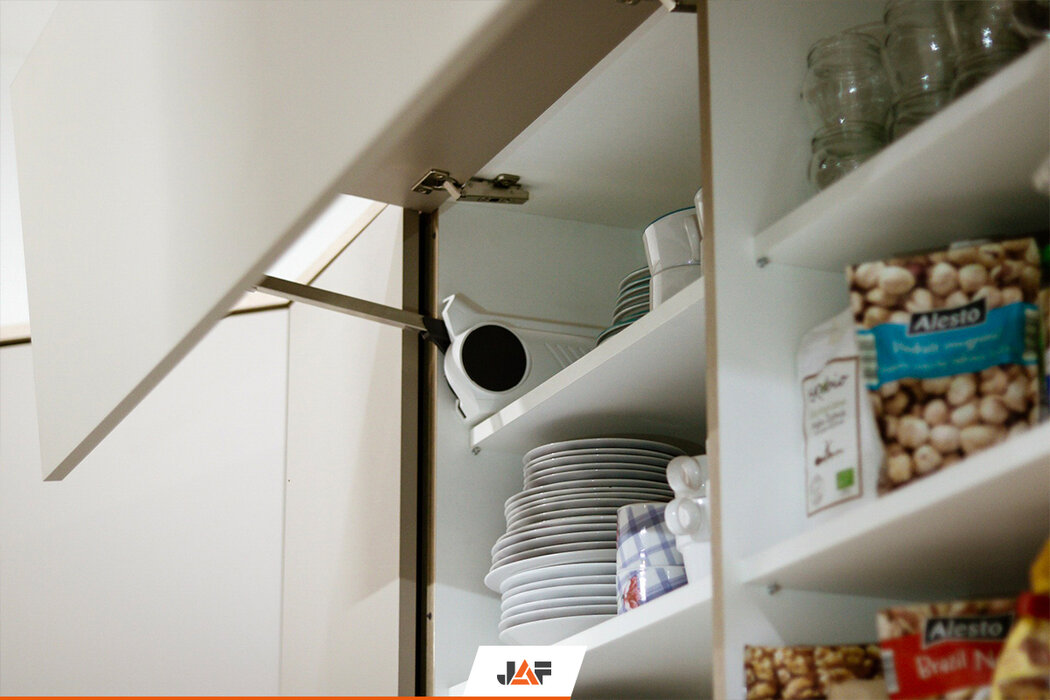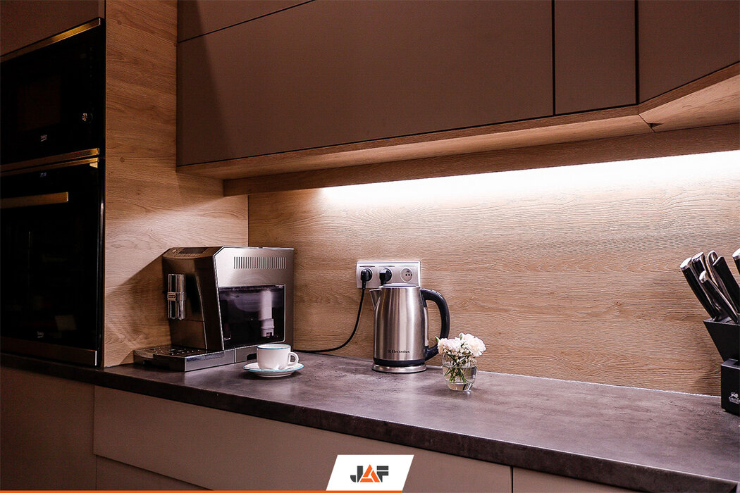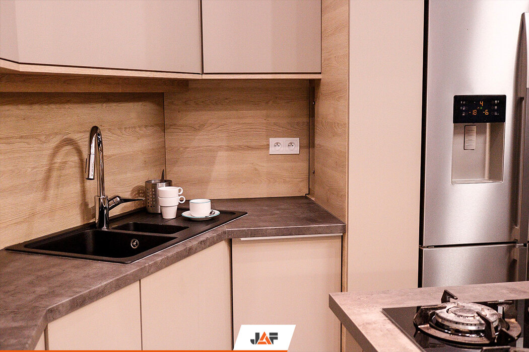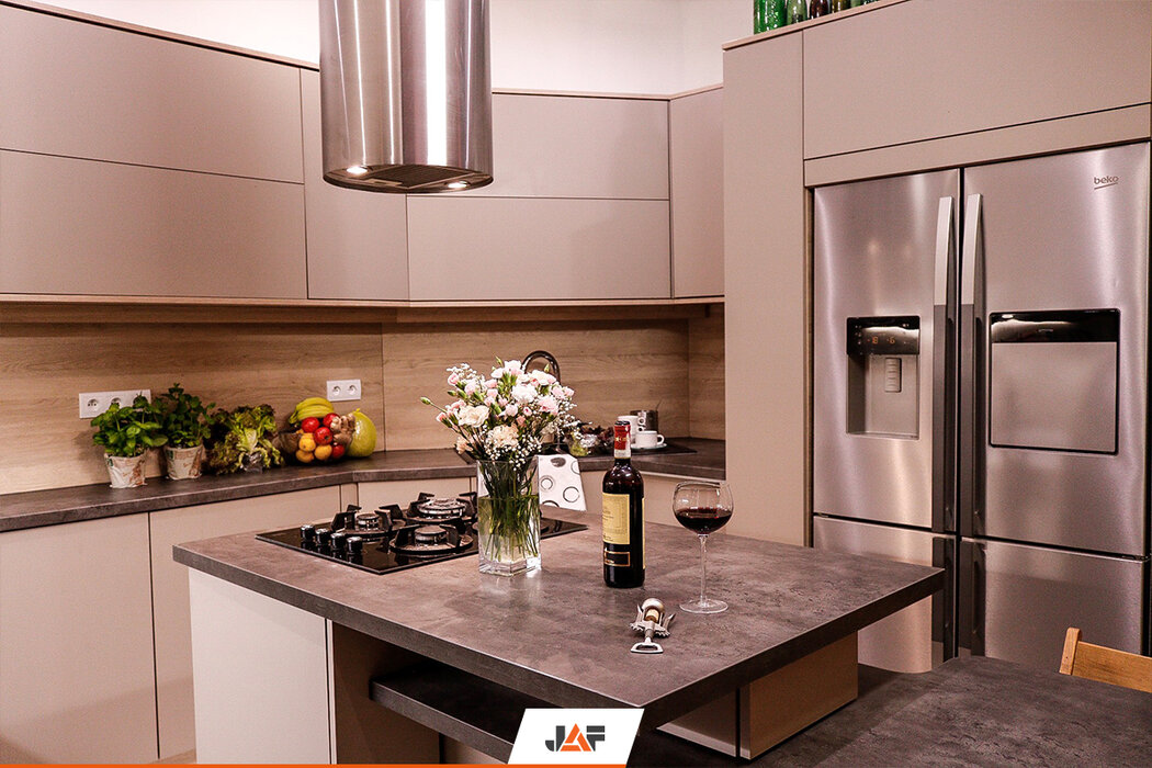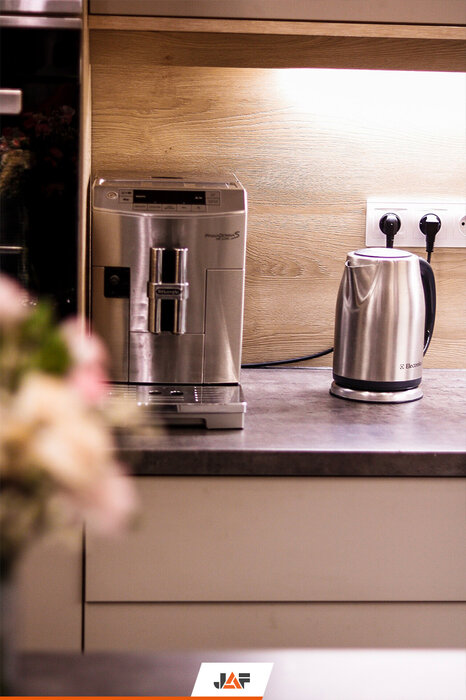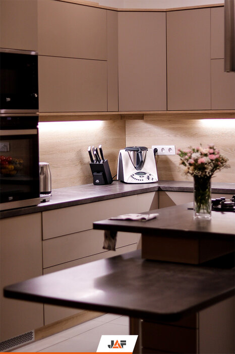 Korpusy wykonano z płyt laminowanych w kolorze Białym Platynowym w półmacie (W980 SM), a ich fronty z płyt MDF Perfect Sense w kolorze Szarego Kamienia w głębokim macie (U727 PM/ST2). Panel wnękowy oraz niektóre elementy korpusów wykonano właśnie z płyt z wyczuwalną w dotyku strukturą drewna - Feelwood - w dekorze Dąb Gladstone Piaskowy (H3309 ST28). Blat roboczy to imitacja Betonu (F275 ST9), a wisienką na torcie są okucia firmy Blum.