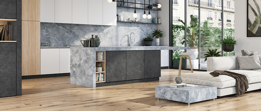 Laminaty to sprawdzony sposób, aby wprowadzić do wnętrza wizualne walory poszczególnych materiałów — bez ich uciążliwych cech. Lite drewno się odkształca, metal brudzi i może być niebezpieczny w dotyku. Marmur jest kruchy, a do tego chłonie ślady po buraczkach jak gąbka, co może nie przeszkadza na parapetach, ale na blacie już tak. Wszystkie z powyższych są też ciężkie i trudne w obróbce pod kątem zabudowy na wymiar. Na szczęście współczesna gama dekorów i struktur zadowoli nawet najbardziej wybrednych.