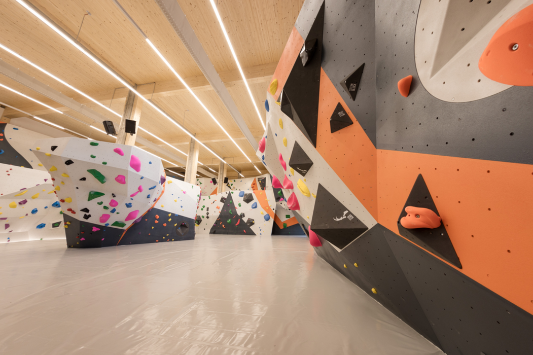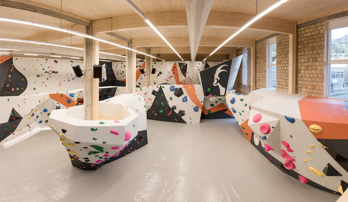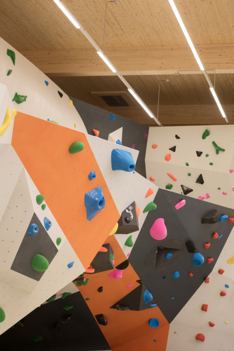 Specjalne rozwiązania potrzebne są również w specjalnych miejscach – jak na przykład w tej hali do boulderingu w Dornbirn (Austria). Ze względu na wszechstronność zastosowań i stabilność wymiarową drewno klejone krzyżowo (sklejka) jest częst wybieranym materiałem, gdy poszukuje się indywidualnych odpowiedzi na trudne pytania. Tak jak w tym przypadku, ponieważ ścianki wspinaczkowe powinny nie tylko zapewniać wymagające trasy, ale także wytrzymywać intensywne użytkowanie. Po szczegółowych poradach firmy JAF Kramsach (Austria) wybór padł na sklejkę brzozową ze szczególnie odporną powierzchnią.