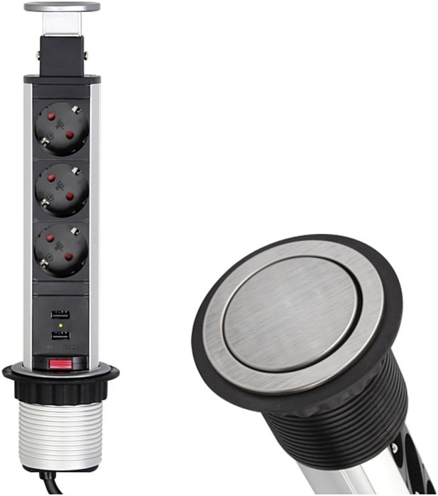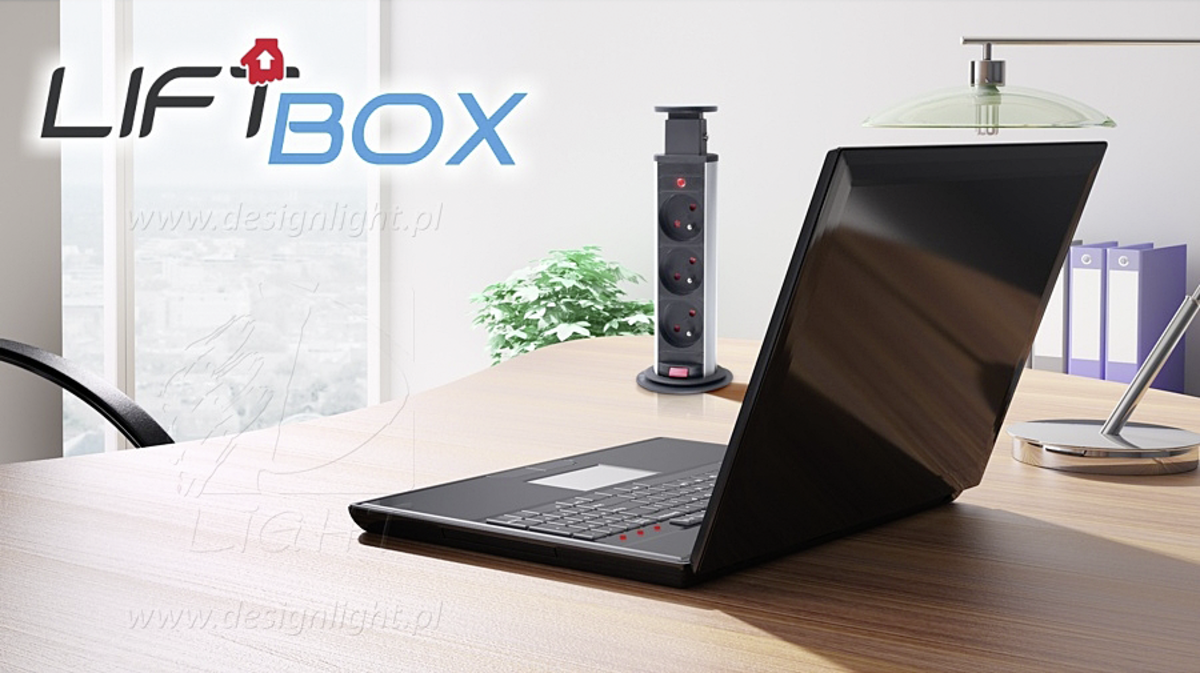 Przedłużacz meblowy LIFT BOX jest montowany i chowany w blacie. Jeżeli potrzebujemy dodatkowego gniazda, żeby podłączyć jakieś urządzenie, np. ładowarkę do telefonu, wystarczy przycisnąć guzik i wyciągnąć gniazdo ze „skrytki”. Dzięki temu LIFT BOX USB jest praktyczny i pomaga zaoszczędzić cenne miejsce.