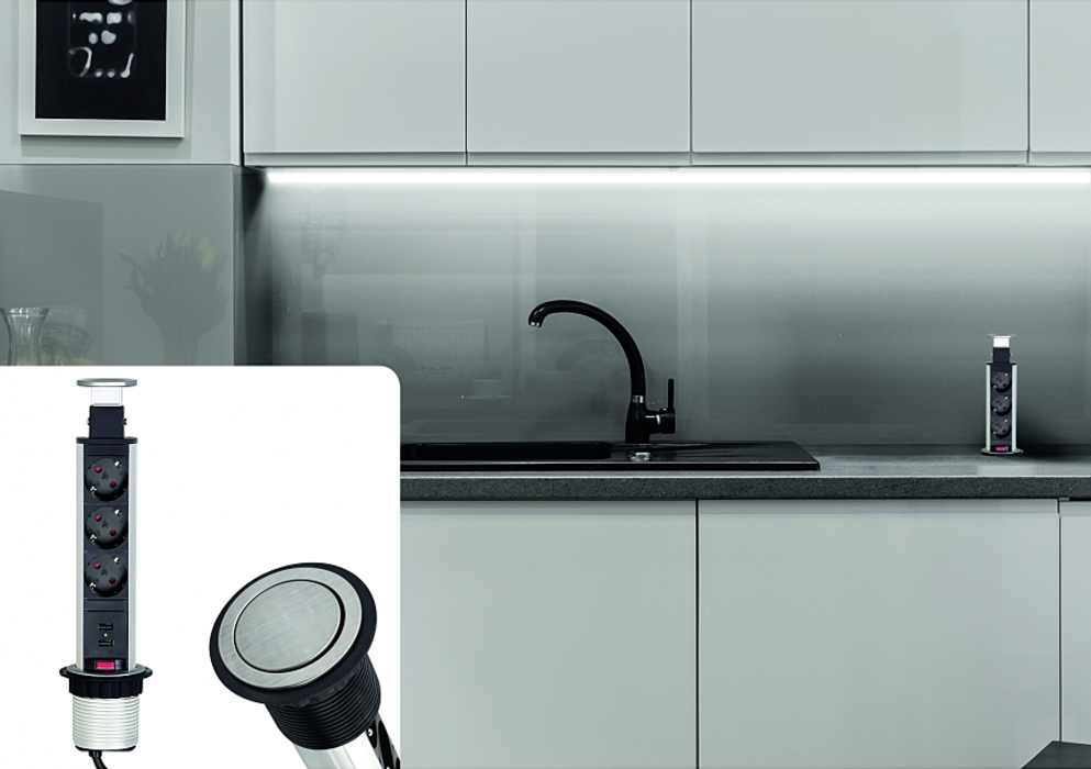 LIFT BOX USB to nowoczesne gniazdo meblowe stosowane w meblach biurowych i kuchennych.