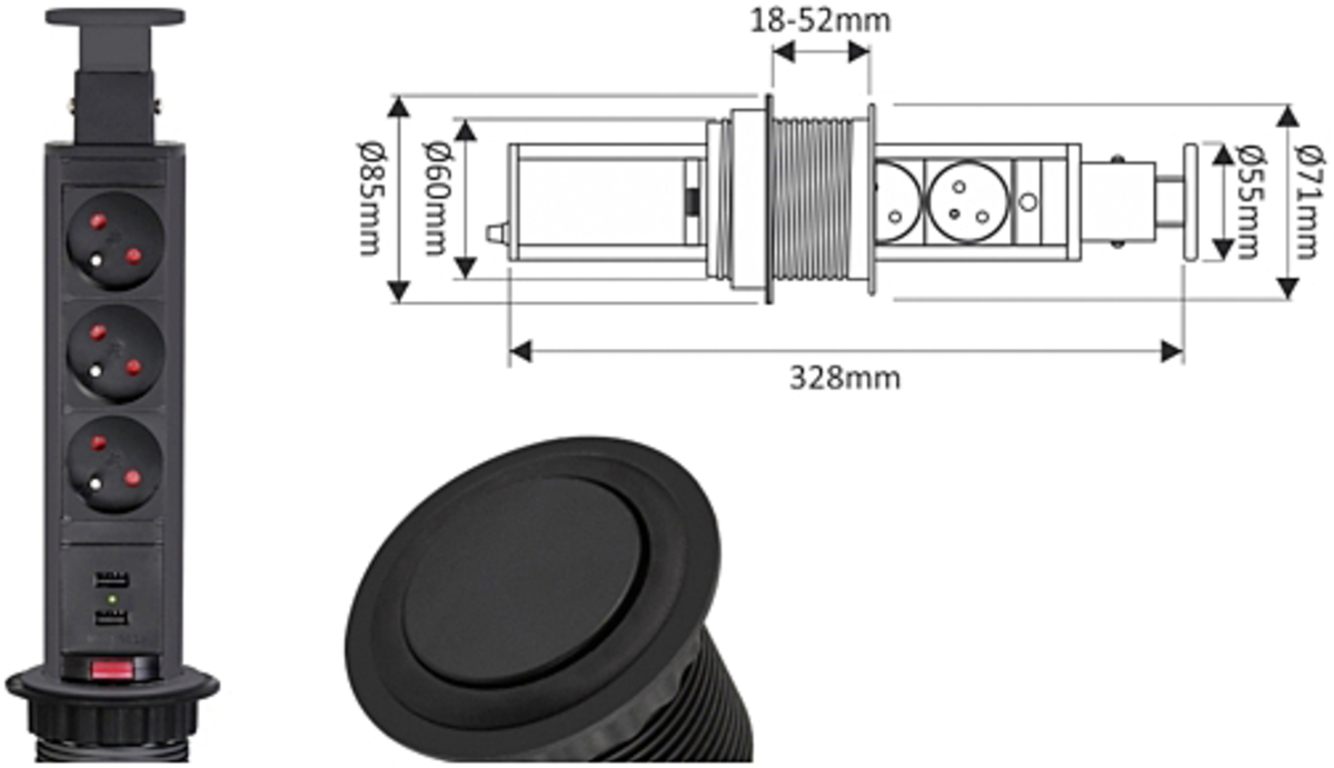 Design Light LIFT BOX USB gniazdo meblowe, LIFTBOX-STD-3FR-U-01