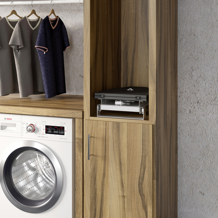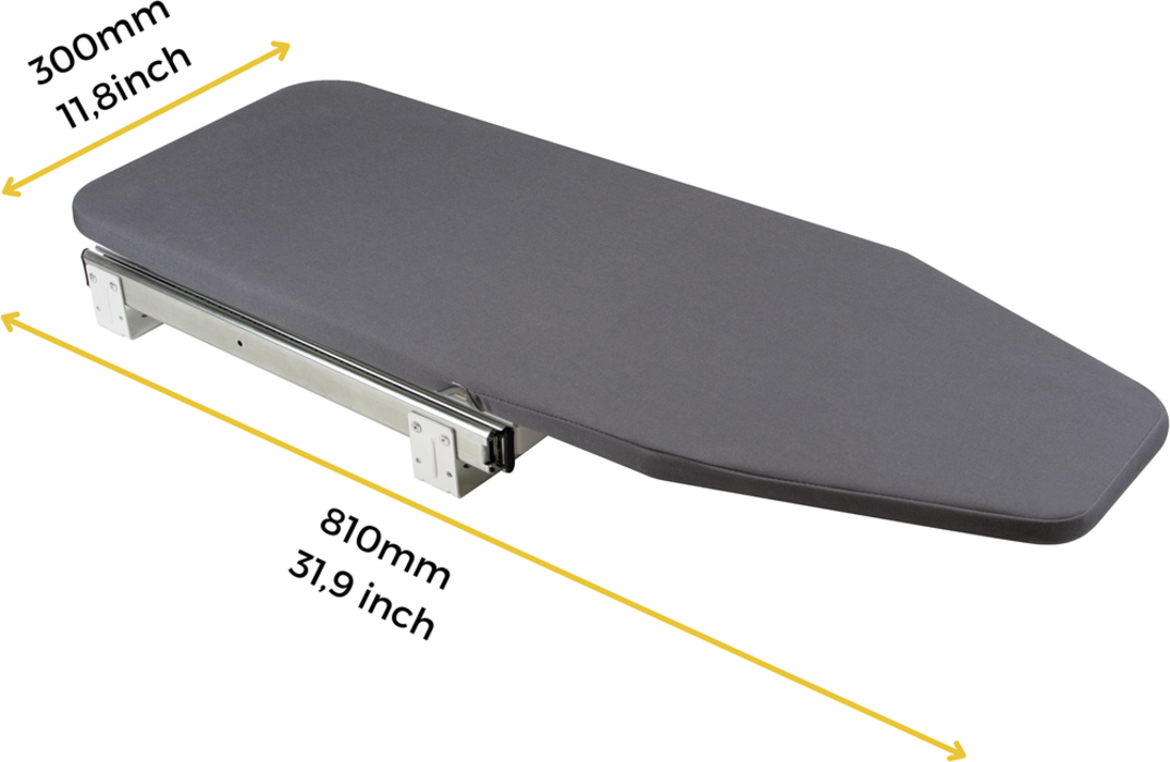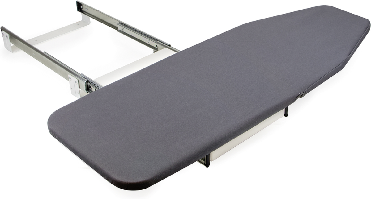 Składana deska do prasowania, idealna do montażu na meblu bądź na półce wewnątrz szafy. Dzięki temu, złożona pozostaje ukryta i zajmuje mniej miejsca niż tradycjonalne deski do prasowania.