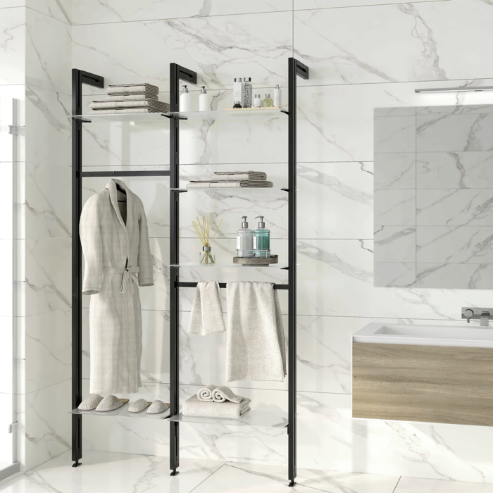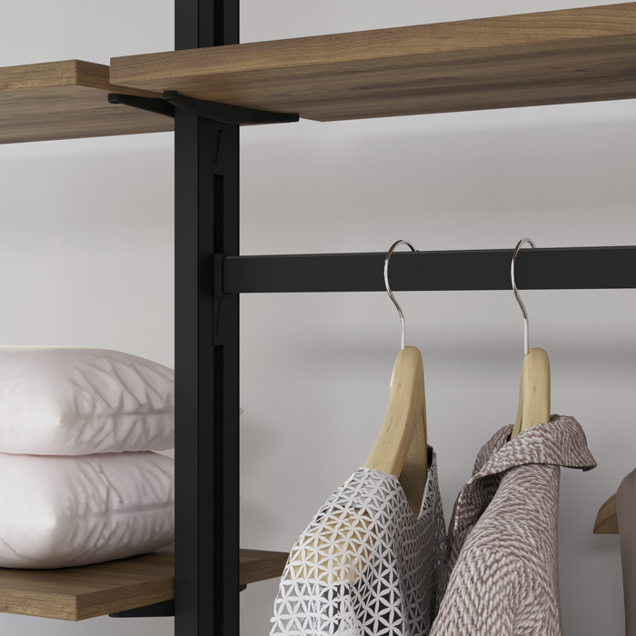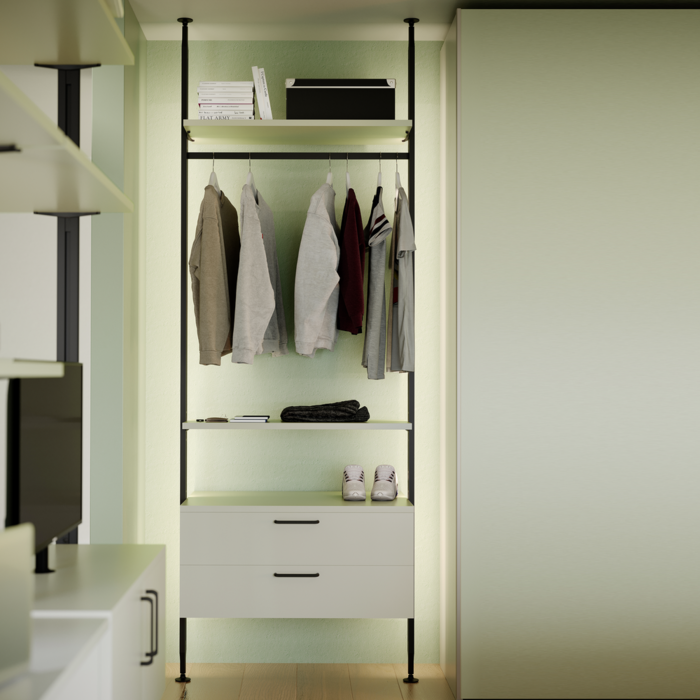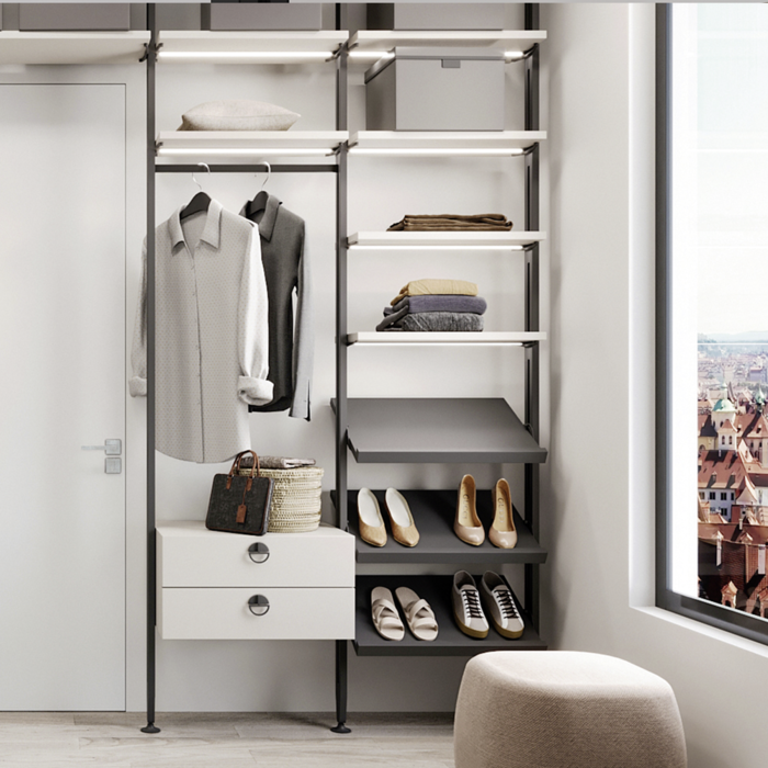 Profile i akcesoria Zero do tworzenia regałów modułowych. Profile są wykonane z aluminium, a akcesoria łączące i wsporniki ze znalu, a wszystkomalowane na czarno z fakturą (RAL 9005). Prostota i design pozwalają na szybkie dostosowanie systemu Zero do przestrzeni dowolnego typu: domostwo, garderoba, biuro czy sklep. Możesz łączyć różne elementy, aby stworzyć idealną kompozycję: drewniane lub szklane półki, moduły lub małe szafki i drążki na wieszaki.
