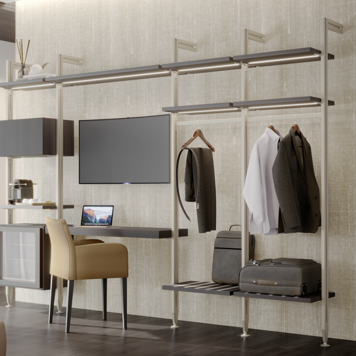 Profile i akcesoria Zero do tworzenia regałów modułowych. Profile są wykonane z aluminium, a akcesoria łączące i wsporniki ze znalu, a wszystko kolorze szarego kamienia teksturowanego (RAL 7048). Prostota i design pozwalają na szybkie dostosowanie systemu Zero do przestrzeni dowolnego typu: domostwo, garderoba, biuro czy sklep. Możesz łączyć różne elementy, aby stworzyć idealną kompozycję: drewniane lub szklane półki, moduły lub małe szafki i drążki na wieszaki.