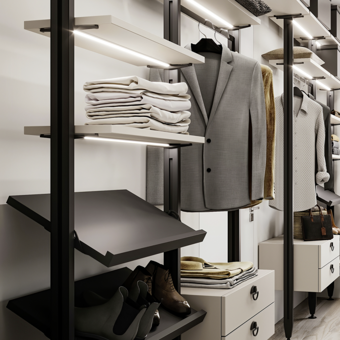 System pozwala na odchylanie półek poprzez poluzowanie śruby radełkowanej dołączonej do wspornika. Posiada 5 poziomów nachylenia: 12º, 24º, 36º, 48º i 60º w obu kierunkach (łącznie 120º). Umożliwiają regulację wysokości i zawierają wsporniki Zero, które blokują system, aby zapobiec niezamierzonemu przesunięciu półki w górę lub w dół.