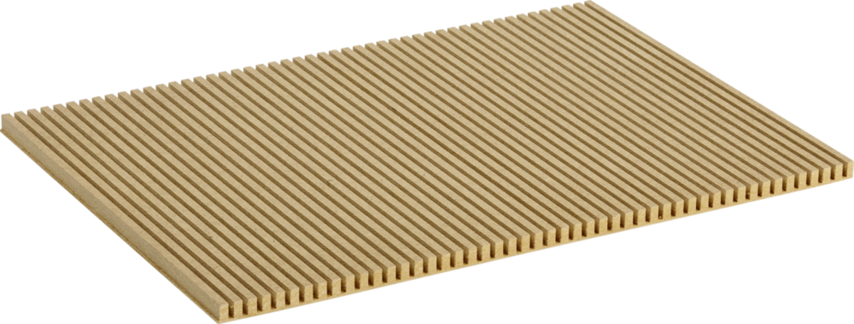 Płyta MDF z głębokim, ciągłym, podłużnym rowkiem po jednej stronie, umożliwiającym zginanie gładkiej strony, dzięki czemu uzyskuje się optymalną powierzchnię do lakierowania lub powlekania. Do zastosowań w suchym środowisku. Klasa użytkowa 1. Emisja formaldehydu: Klasa E1. (E-Z) : Niska emisja formolu<0,05 ppm (EN717-1), CARB2. Zastosowanie: szpitale, salony sprzedażowe, biura, wnętrza.